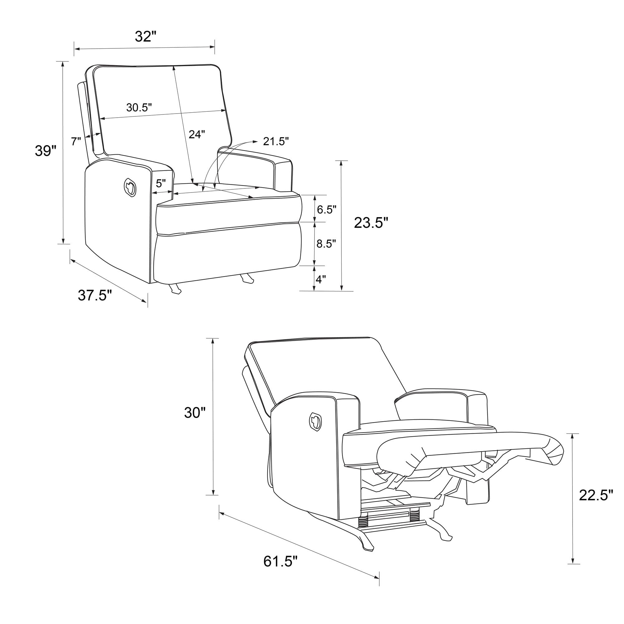 Baby room approved, this modern 2-in-1 rocker recliner with soft touch upholstery delivers gentle reclining and rocking chair movements to pacify any fussy infant to sleep for calming relief and seamless nursery style that works in every decorOffering multi-position pushback recline comfort to moms and dads, the pillow back cushioned backrest, padded track arms, and pocketed coil foam T-cushion seat lessen tension and the easily accessible handle pulls out the footrest to ease tired legsMade for parents with kid’s room, living room, and bedroom worthy design, this adaptable chair is constructed with a sturdy plywood frame, no-sag spring foundation, steel recline mechanism, and metal base for superior supportShips in one easy to handle box with all parts, tools, and instructions included for rapid and straightforward assembly in under 15 minutes. Easy to clean 100% polyester chenille fabric is resilient and wipes free of spills and stains with a damp clothRecliner dimensions: 32″L x 37″W x 39″H. Weight limit: 250 lbs. Net weight: 86 lbs. 1-year limited warranty. Rigorously tested to meet safety standards and flammability requirements. Does not contain flame retardant chemicals. TSCA Certified for formaldehydeSpecifications