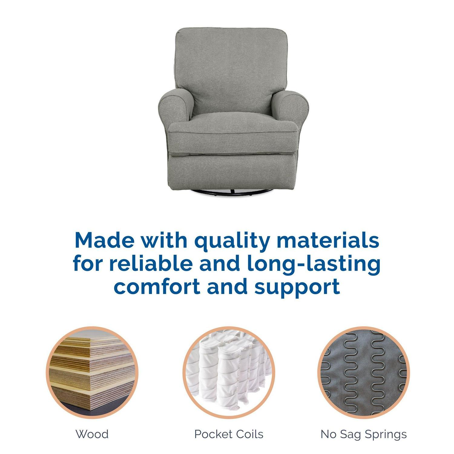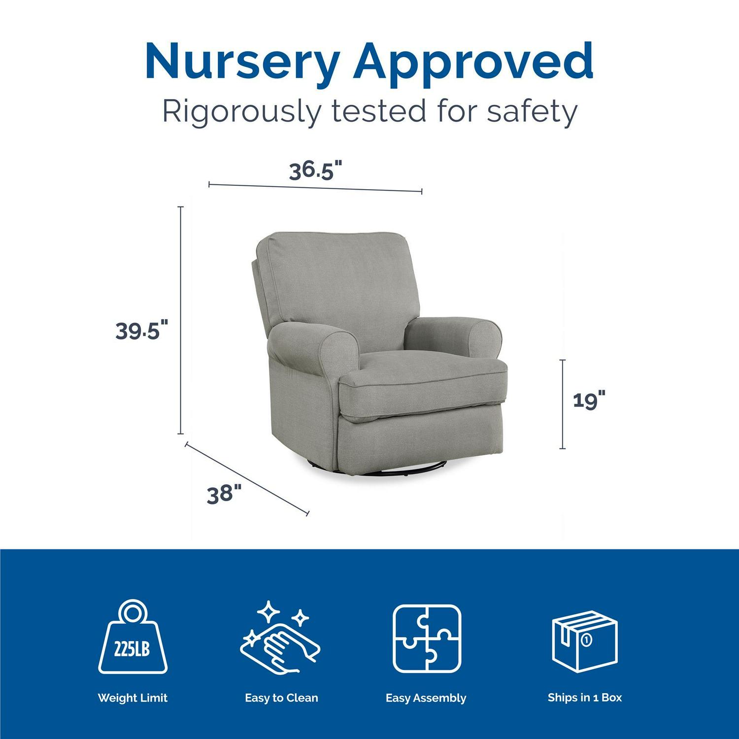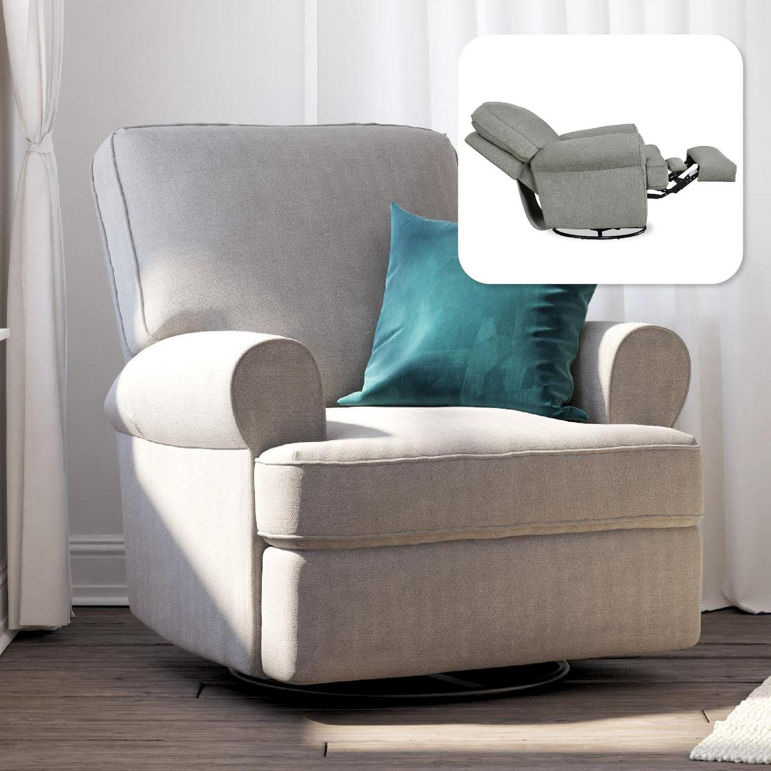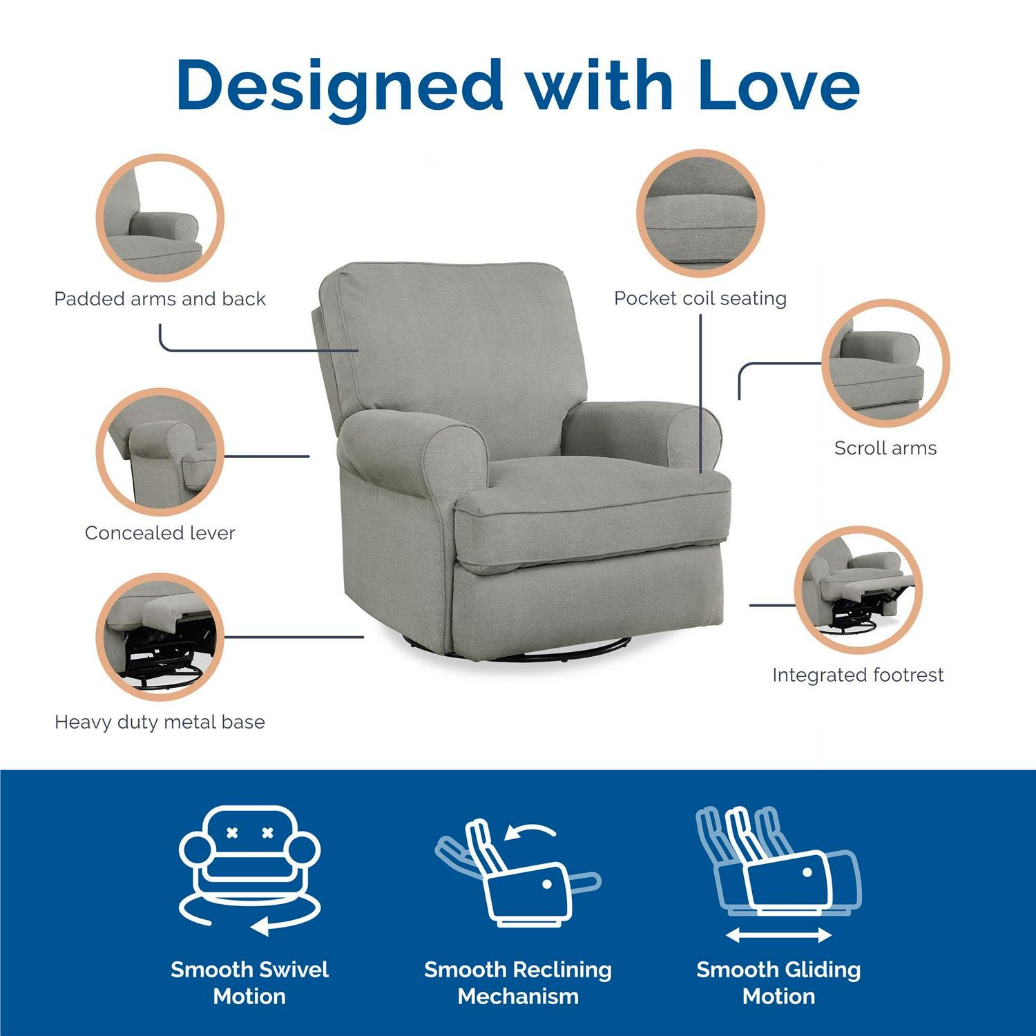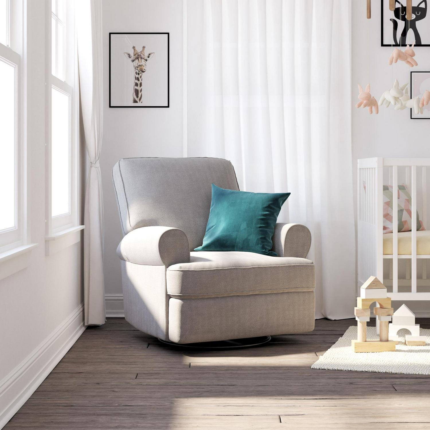 – Large Swivel Gliding recliner with big roll arms for added support and comfort while feeding baby or relaxing.