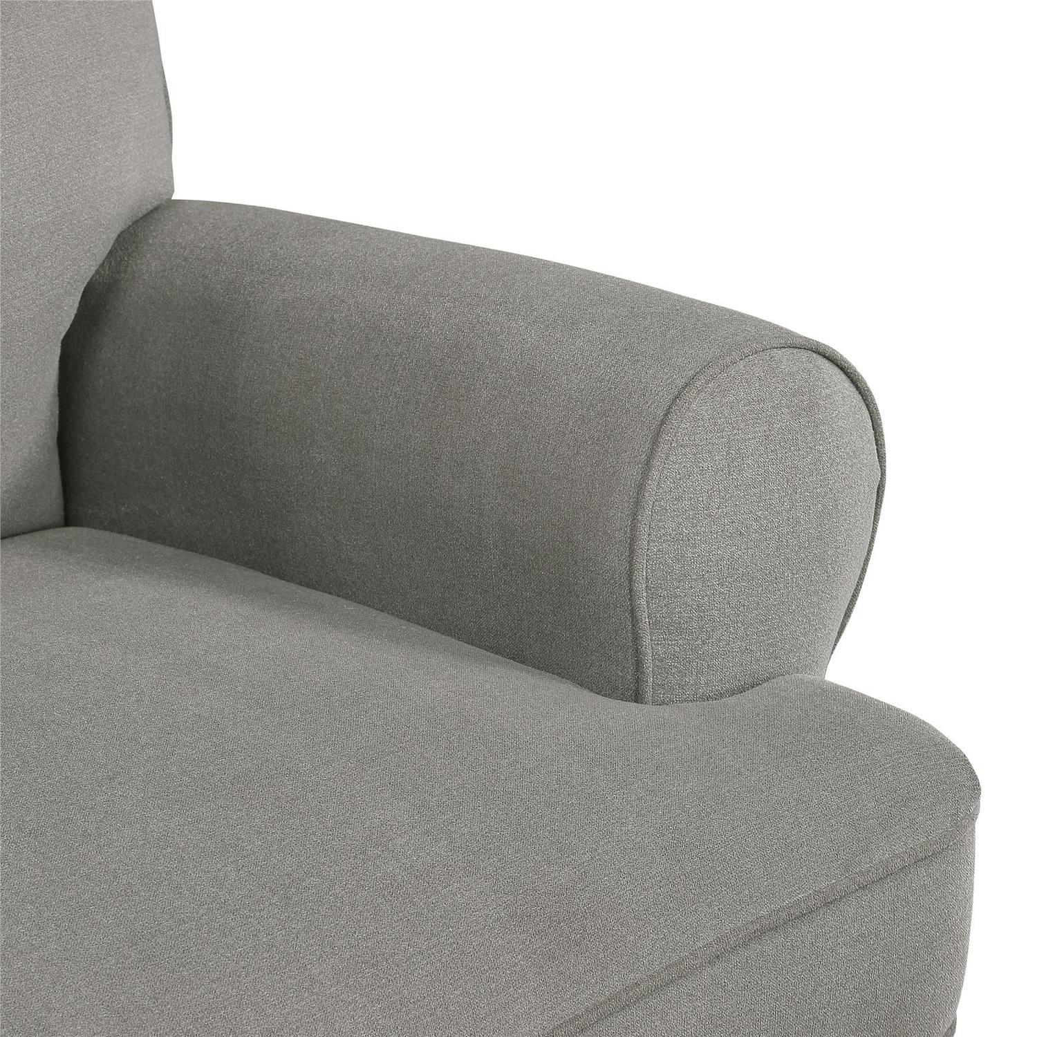 – Upholstered in easy-to-clean Chenille fabric with large overstuffed back cushion for added comfort and “T cushion” seating for more room. Available in Beige or Gray.