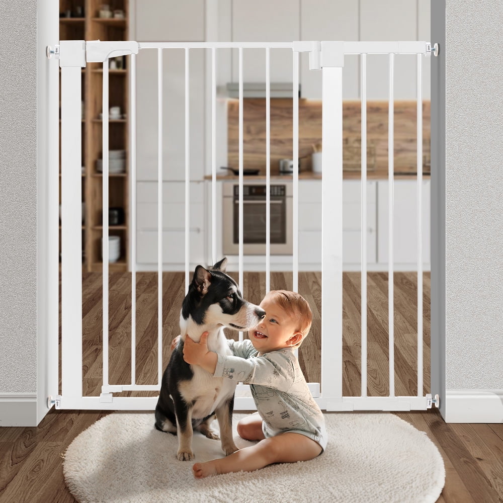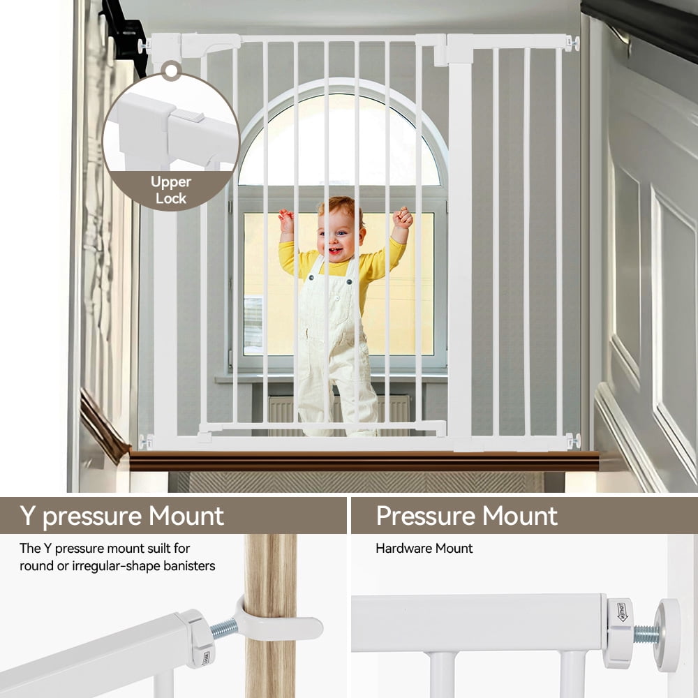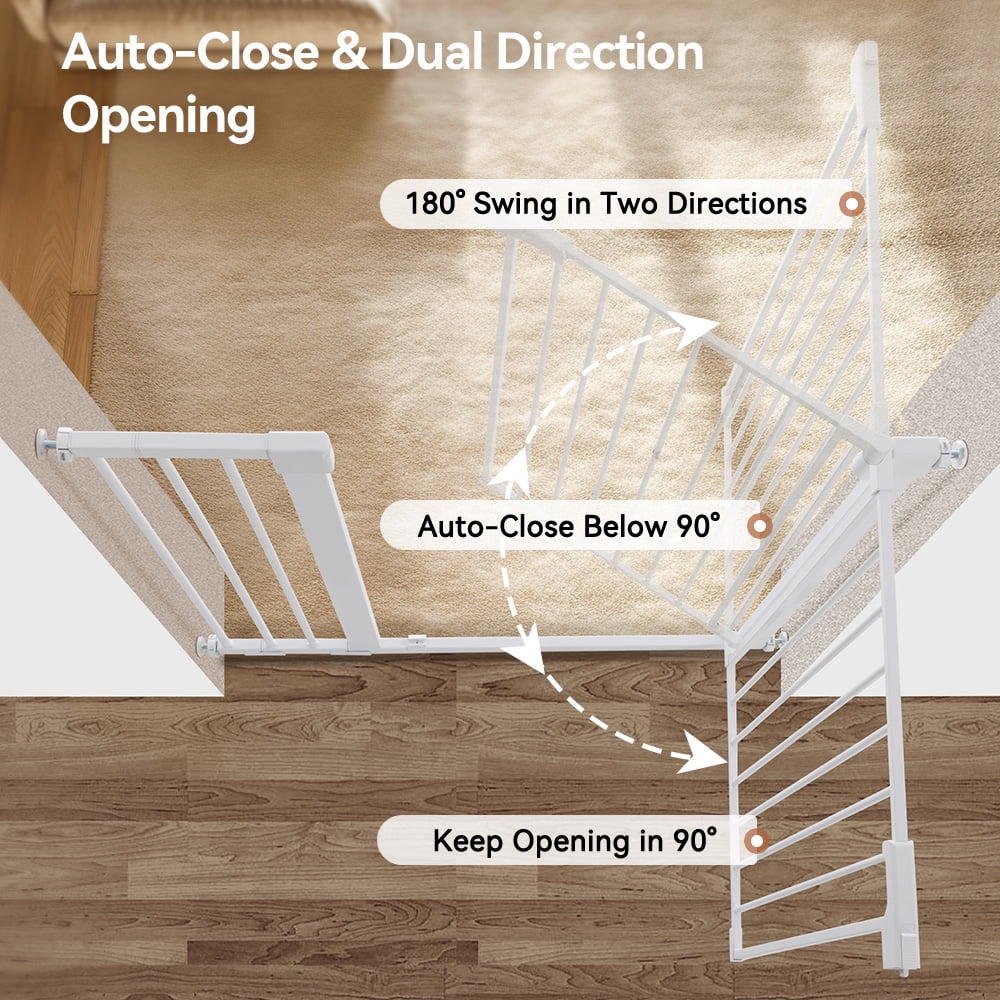 Easy Installation This pressure-installed baby gate does not require any tools and will not damage the wall, suitable for stairs, corridors. Even if you are holding a baby, it can be opened with one hand, so you don’t have to worry about forgetting to lock the safety door. Auto Close Gate No worries about forgetting to lock the dog fence, it will close automatically, easy one-hand operation. Double Safety System The kid gate bar has a double safety door lock system, adults can open it easily but babies can’t open it easily, for 6-24 monthskids. Durable Construction Made of steel that can withstand high impacts of up to 100 lb, maintaining safety and durability. widely used Perfect for doorways, hallways, the bottom of stairs, kitchens, laundry rooms, bedrooms, and playrooms.