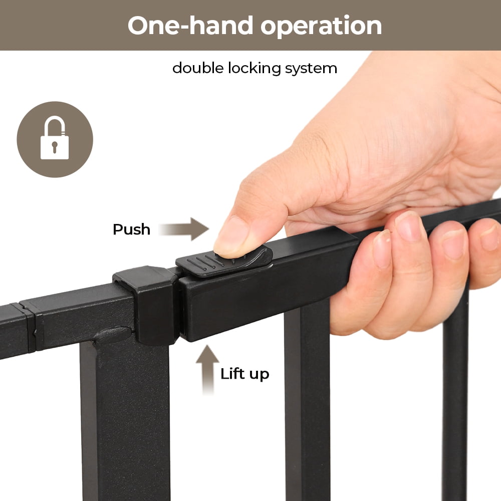 SINGES Extra Tall 30″ Wide 29.5”- 40.5″ Auto Close Baby Gate with Swing Door Small Pet Door for Cat Dog Doorway Stairs-Black/White An essential tool for homes with pets, the SINGES Gate is Extra Wide providing a convenient, chew-proof way to contain and protect both your pet and home. It’s made of heavy-duty, non-corrosive steel with a neutral white or black finish to complement most decors. The extra-wide walk-through pet gate includes a lever-style handle with a one-touch release safety lock that lets you open and close it easily, allowing for convenient and frequent use. It’s also expandable accommodating openings between 29.5″ to 40.5″ and features a pressure mount system that eliminates the need for drilling holes into walls. In addition, the Carlson Pet Gate, Extra Wide, features an 7.6″ x 10.1″ door that lets smaller animals pass through while keeping everyone else out. It’s also lead-free and non-toxic making it a safe and effective way to restrict pets, and even children from entering certain areas of the home. Some assembly is required.