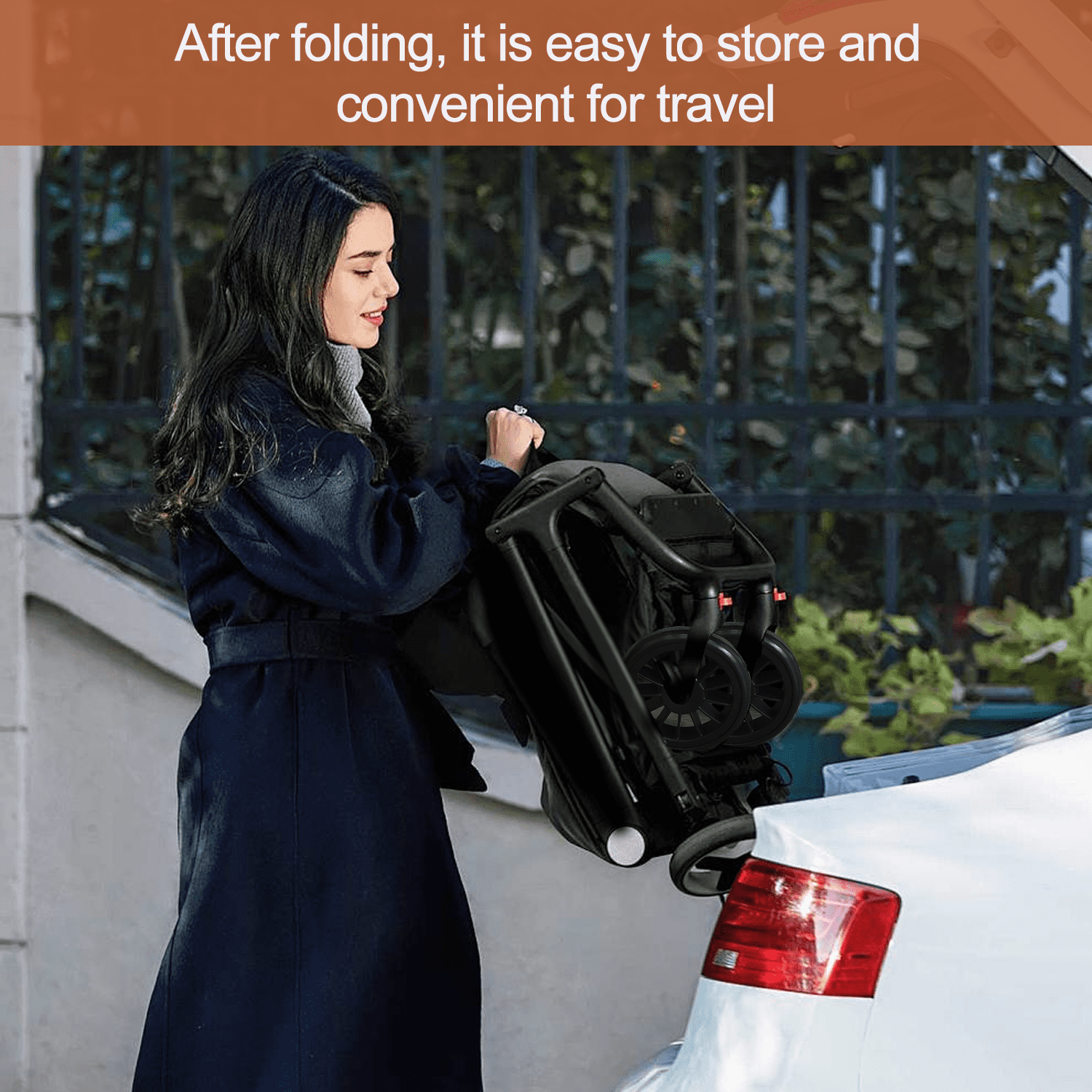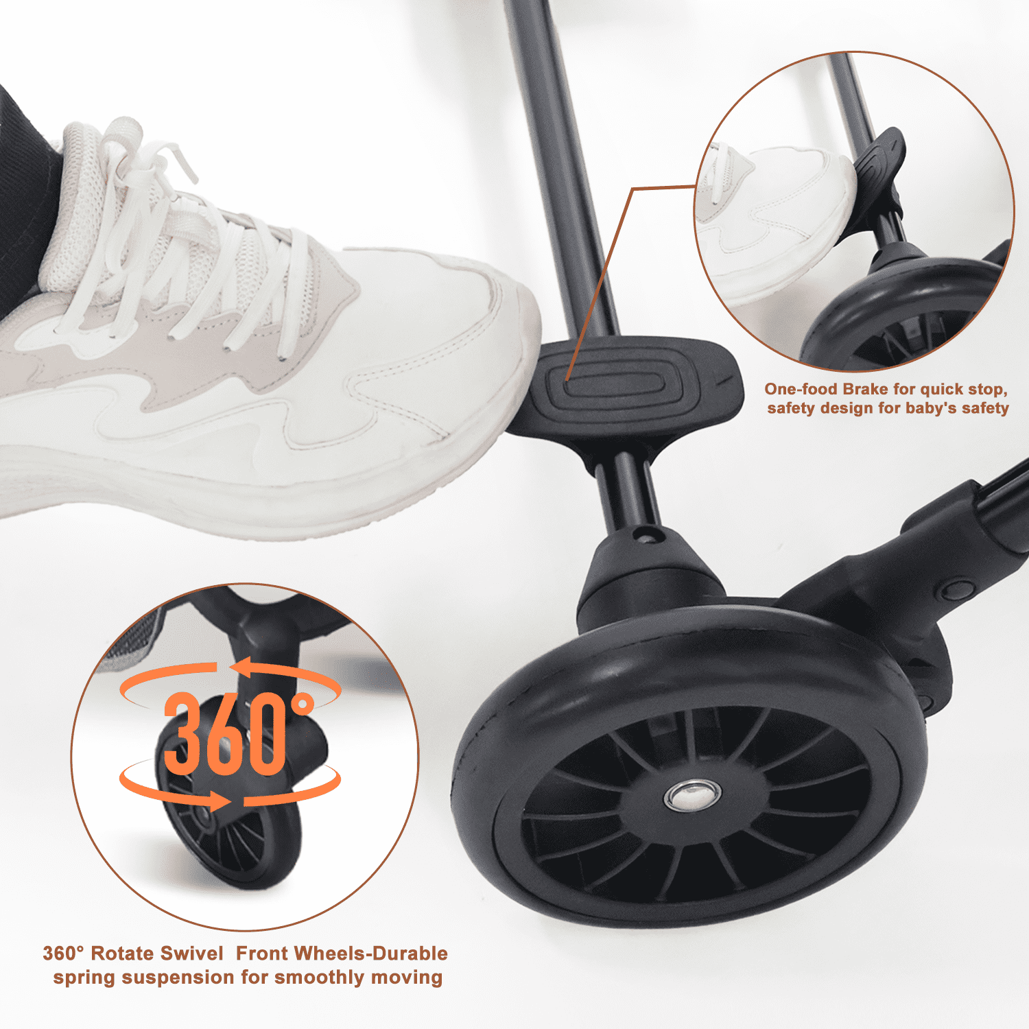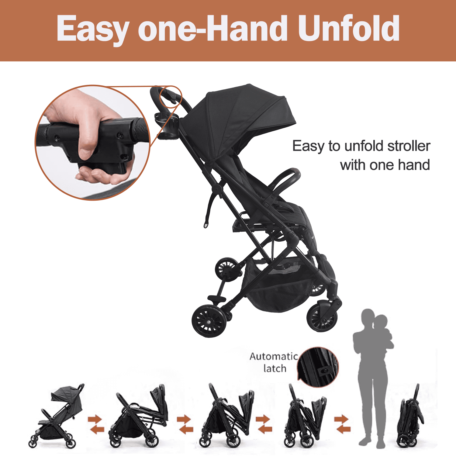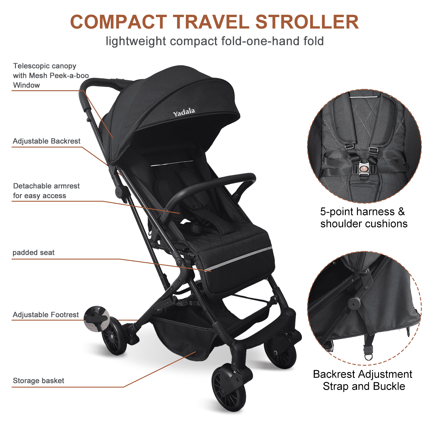 Comprehensive Protection: Our stroller is equipped with a 5-point safety belt, which can gently but firmly fix your baby on the seat.There is a foot brake between the rear wheels, and you can stop the stroller easily when necessary. More importantly, our stroller is made of safe and odorless fabric, providing a healthy environment for your baby. Easy One-Hand Fold and Carry: Our travel stroller features a one-hand fold mechanism, activate the gravity fold feature with a simple squeeze on the handle mechanism,allowing parents to quickly and effortlessly collapse the stroller.Once folded,The convenience stroller features a convenient carry handle, making it easy to transport. You can carry it comfortably with one hand, leaving your other hand free to hold your baby, bags, or other essentials. Its compact folding feature makes it easy to carry, transport, or store,travel or vacations. Adjustable Backrest, Footrest and canopy: We understand the importance of comfort for your little one. Our stroller features adjustable backrest and footrest positions, allowing you to find the perfect angle for your child’s comfort.Our stroller keep your baby protected from the sun with the extendable sun canopy. This adjustable canopy provides ample shade, ensuring your baby stays cool.And zip-extendable a peek-a-boo windows in canopy and a roll-up ventilation window in the back allow you to keep an eye on your baby at all times and enhances airflow. Compact Stroller for Travel Safely: Equipped with a spacious storage basket, this travel stroller effortlessly accommodates your baby’sessentials, ensuring convenient access while you’re out and about. . Whether running errands or exploring the city, itslightweight frame ensures effortless handling and maneuverability. This travel stroller allows for convenient storage in smallspaces, making it ideal for both home and travel. Enjoy flexibility and comfortfor your trip. All-Wheel Suspension: The four wheel suspensions provide unrivaled shock absorption and allow for effortless 360-degree maneuvering, which makes it more steady and smooth when you push the stroller. with foot-activated brakes at the rear wheels keep the stroller in place when parked.