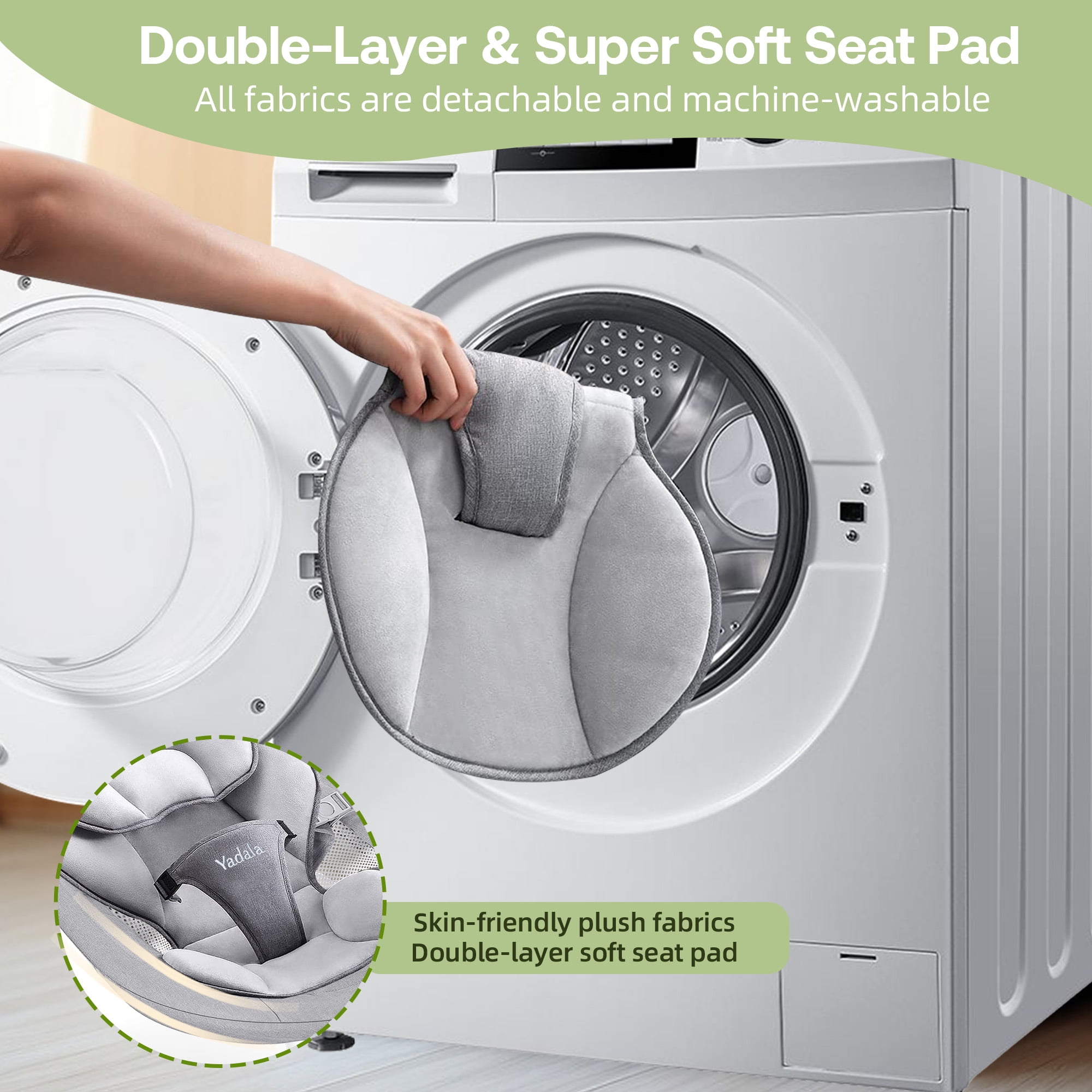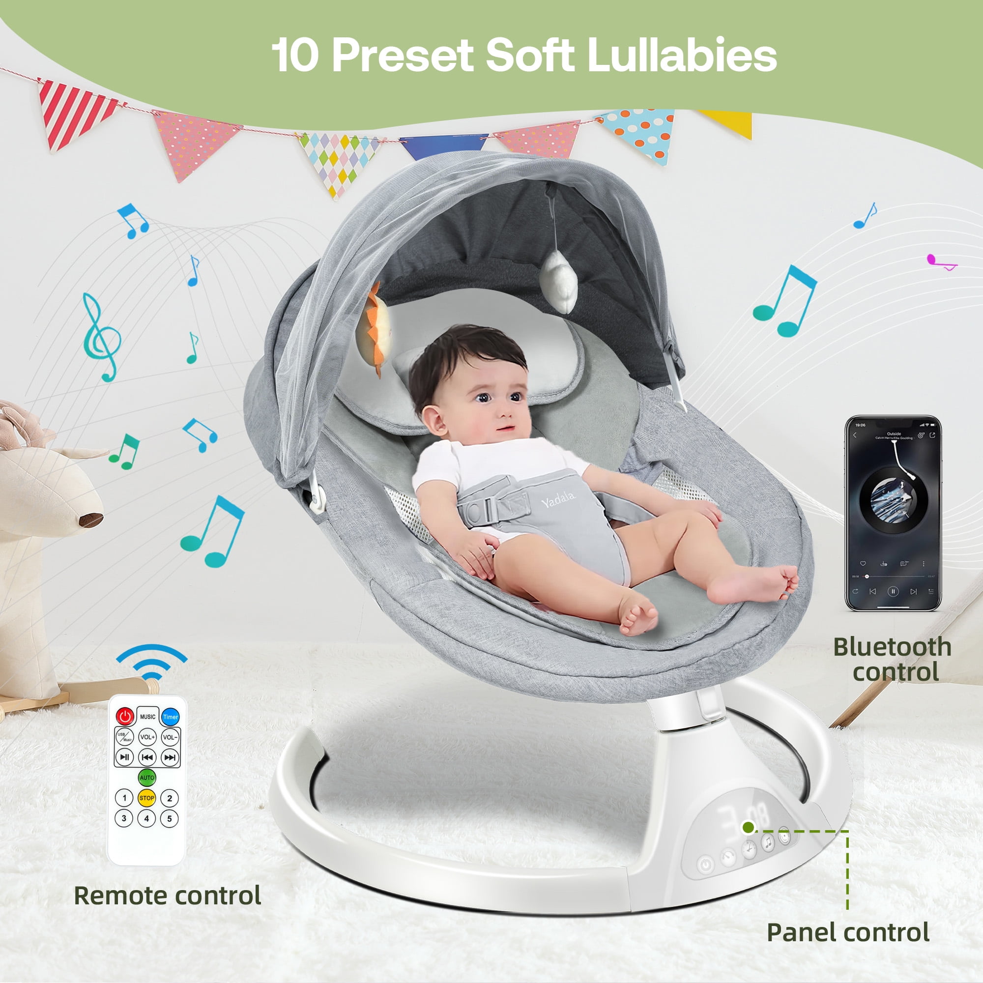 Safe & Stable Design: The firm headrest is specially designed to support the baby‘s head and prevent the baby’s head from tilting to one side. The adjustable five-point safety harness can prevent the baby from sliding off to ensure the baby’s safety very well. The high-quality metal aluminum base and anti-skid grips provide stability for the baby bouncer seat for babies 0-12 months or up to 26 lbs. Ultra-Soft Removable Seat Pad: The double-layer seat pad is made of high-quality soft fabrics for ultimate comfort at home, and they are machine washable and reversible for convenience. Not only do babies feel comfortable, but the parents also feel more worry-free. A breathable mosquito net and 2 plush toys are included. 5 Natural Swing Speeds: The Yadala swing for babies replicates the natural motion of parents, and sways from side to side to comfort your babies. Our infant swing comes with 5 different swing speeds, so you can find the right soothing pace to quickly calm and relax your baby. You are convenient to set the time to 15, 30, 45 minutes to save your time and energy. Bluetooth Music Player & Remote Control: This baby rocker for infants has 10 preset lullabies. It also allows you to play your baby’s favorite soothing songs or nursery rhymes from your phone, offering peaceful or joyful moments for your little one. The touch panel and remote control make operating the swing baby more flexible and easier. Simple Installation & Indoor and Outdoor Use: You just need about 3 minutes to quickly install. The lightweight design and quick fold make this outdoor baby swing an ideal choice for travel. The swing for baby can be plugged in for use indoors and powered by a power bank when outdoors. Whether going to the grandparents’ house or on a weekend picnic, the portable baby swings for infants can ensure babies always have a familiar and comfortable resting space.