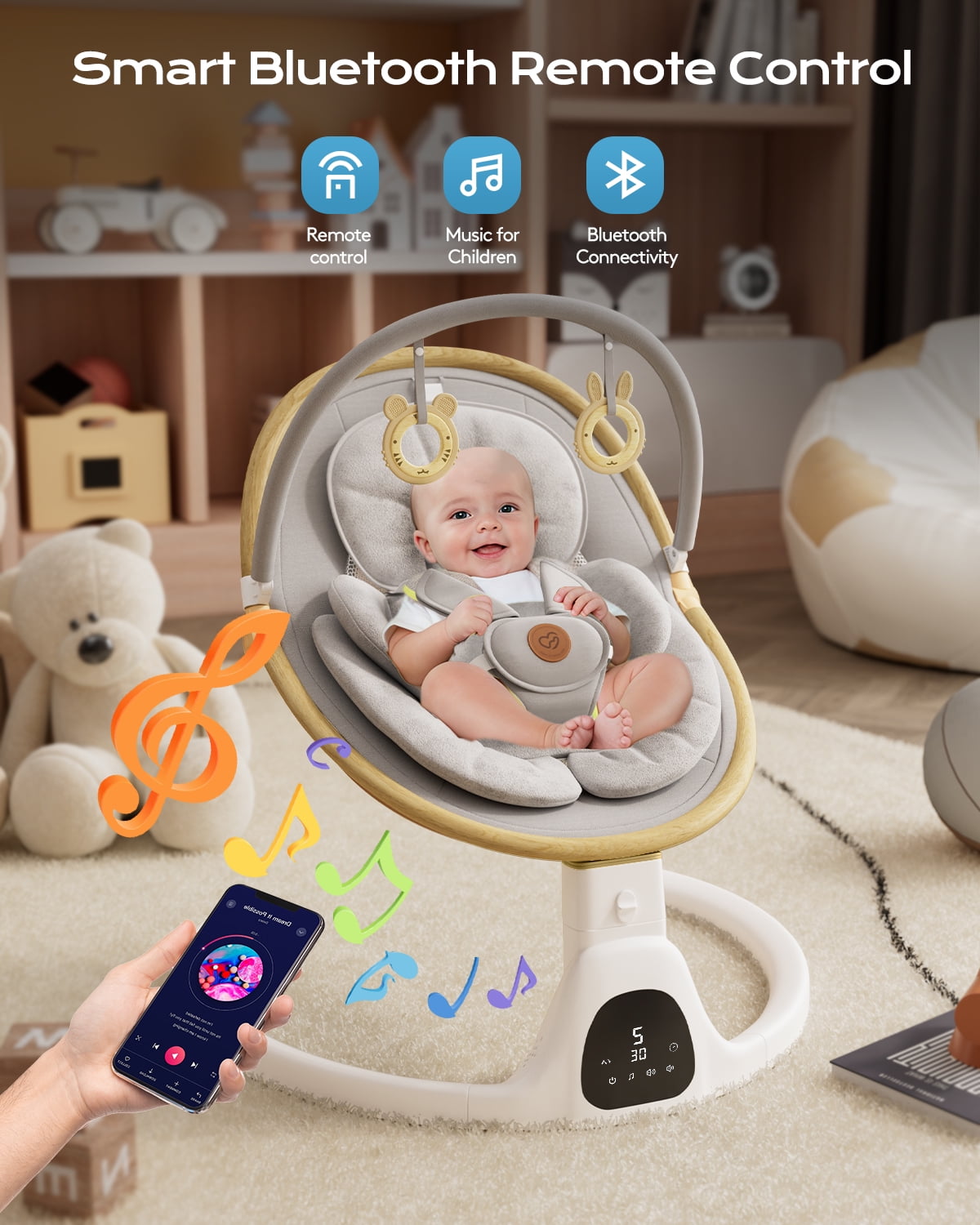【Scientific 5 Multiple Sway Speeds】The baby swing for Infants features the 5 unique swing speeds:18°、21°、23°、25°、31°, that can help your baby calm down. With the ergonomic 25° spine tilt design, the swing takes care of your baby’s spine development. Suitable for babies 5-20 Lb, 0-6 Months. 【5-Point Harness & Detachable Protective Net】Safety Comes First! The baby bouncer features a 5-point harness, soft and skin-friendly fabrics,anti-skid and easy-to-clean seat pad that bring safer protection and comfort to your baby. The durable aluminum base is fitted with anti-skid grips that provide stability. 【Portable Baby Swing for infants to toddler】The lightweight infant swing has travel size and is perfect for transporting. You just need about 3 minutes to quickly install. The detachable net and canopy prevent other animals from bothering babies in summer.Assembled dimensions: 25.6 (l) x 25.6 (w) x 28.1(h) inches. 【Bluetooth Music Speak & Remote Control】With Bluetooth connection for playing music, you can play nursery rhymes and songs from your phone. Touch Key and Remote Control are two ways to help you control the baby swing chair, allowing you have your own space and time. With 3 timing functions, you can set the time at will for 8-15-30 minutes, effectively saving your time and energy.