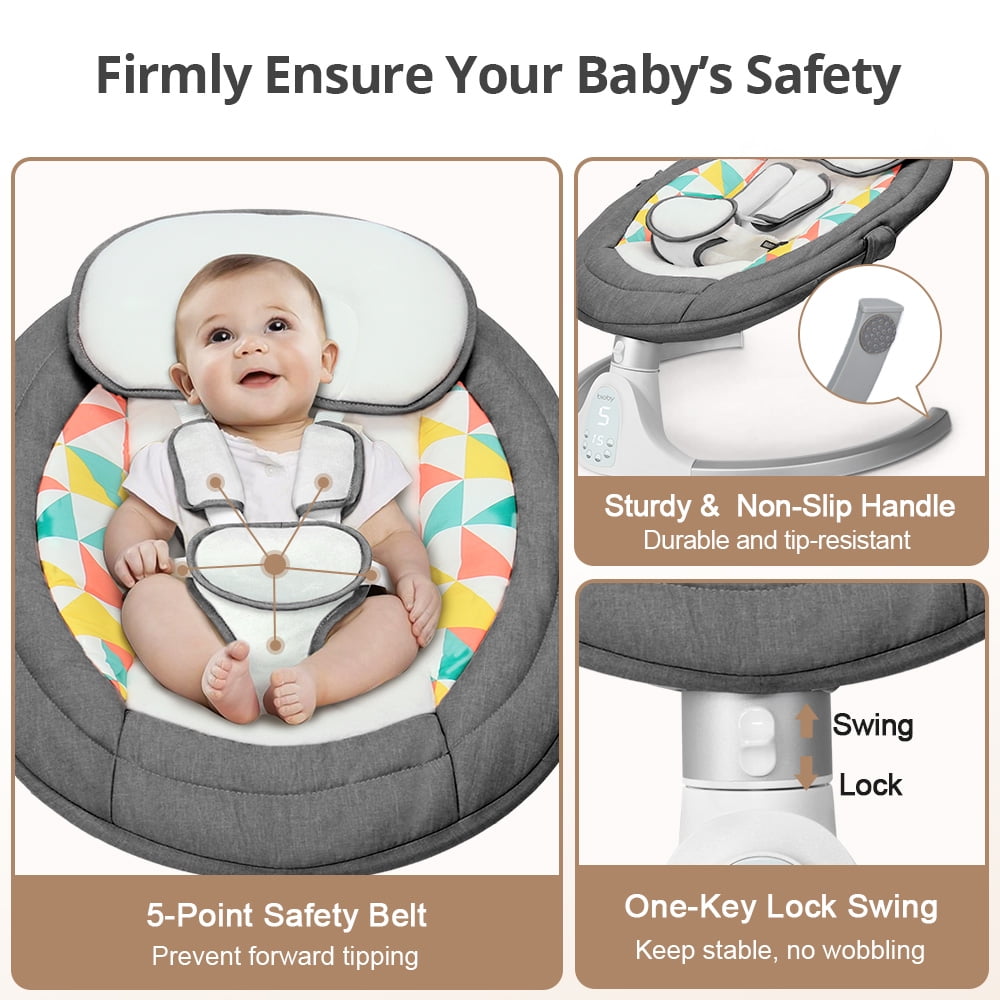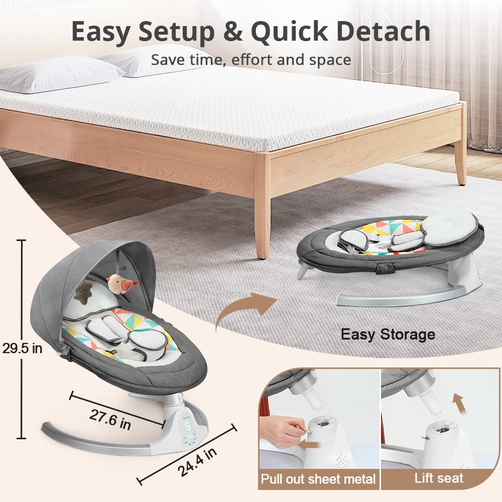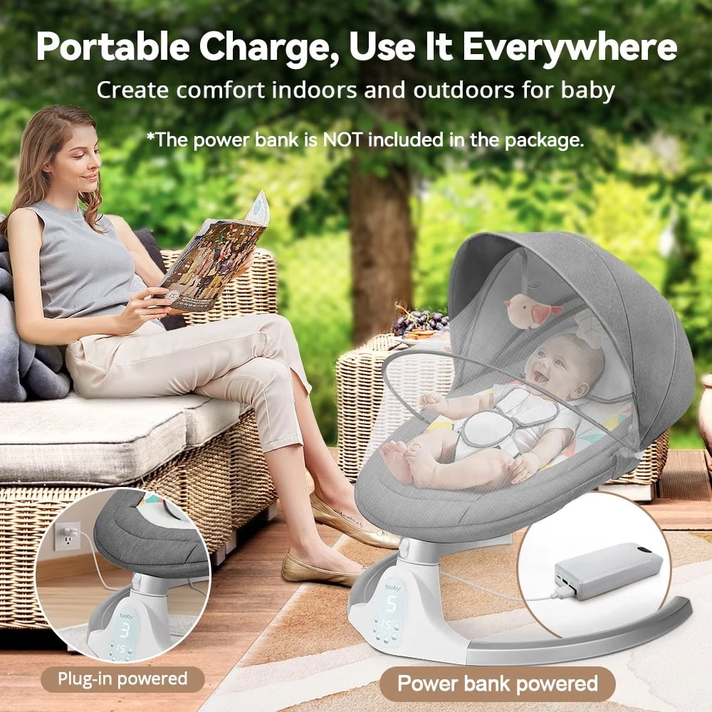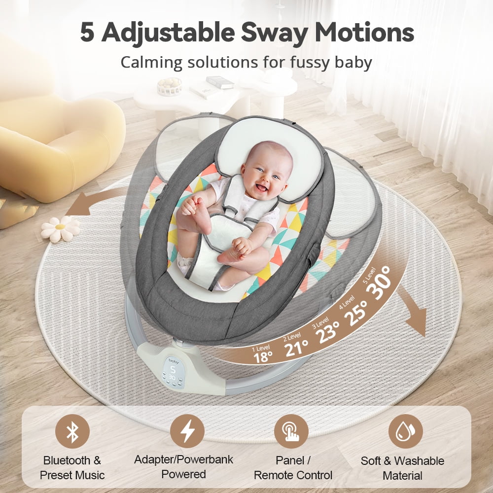 Key Features: Convenient Touch Screen& Remote Control The touch screen display is smart, intuitive and easy to use. Effortlessly operate the electric baby swing from a distance, allowing you to adjust swing speed, choose songs, and control other functions without disturbing your baby’s relax. 5 Speeds & 3 Time Settings The baby swing for newborn features a bionic design that mimics the parent’s arms’ natural side-to-side swaying, with 5 different swing speeds for your choice, including 18°, 21°, 23°, 25°,31°. When you are busy, you can also set the 3 different swing times: 8 / 15 / 30 minutes, which not only lets the baby peace and relax, but also lets the parents save the heart. 2 Hanging Toys& Mosquito Net This portable baby swing is very simple to put together and pack down, easy to store or transport, which includes a mosquito net and 2 hanging toys, protecting your baby and getting a better feeling. Bluetooth Play The baby swing for infants comes with a Bluetooth music player, built-in some preset songs. Enabling Bluetooth to control sounds and play your baby’s favorite music will calm your baby down. Premium Cushion& Frame The electric baby swing seat cushion is made of high-quality soft crystal velvet fabric, which is ultimately soft and breathable, and equipped with an adjustable belt harness, making your baby can enjoy ultimate comfort and safety at home. In another hand, the baby swings for infants’ base and frame provide a stable and sturdy structure, fit for babies weighing up to 24 pounds and aged 0-8 months.