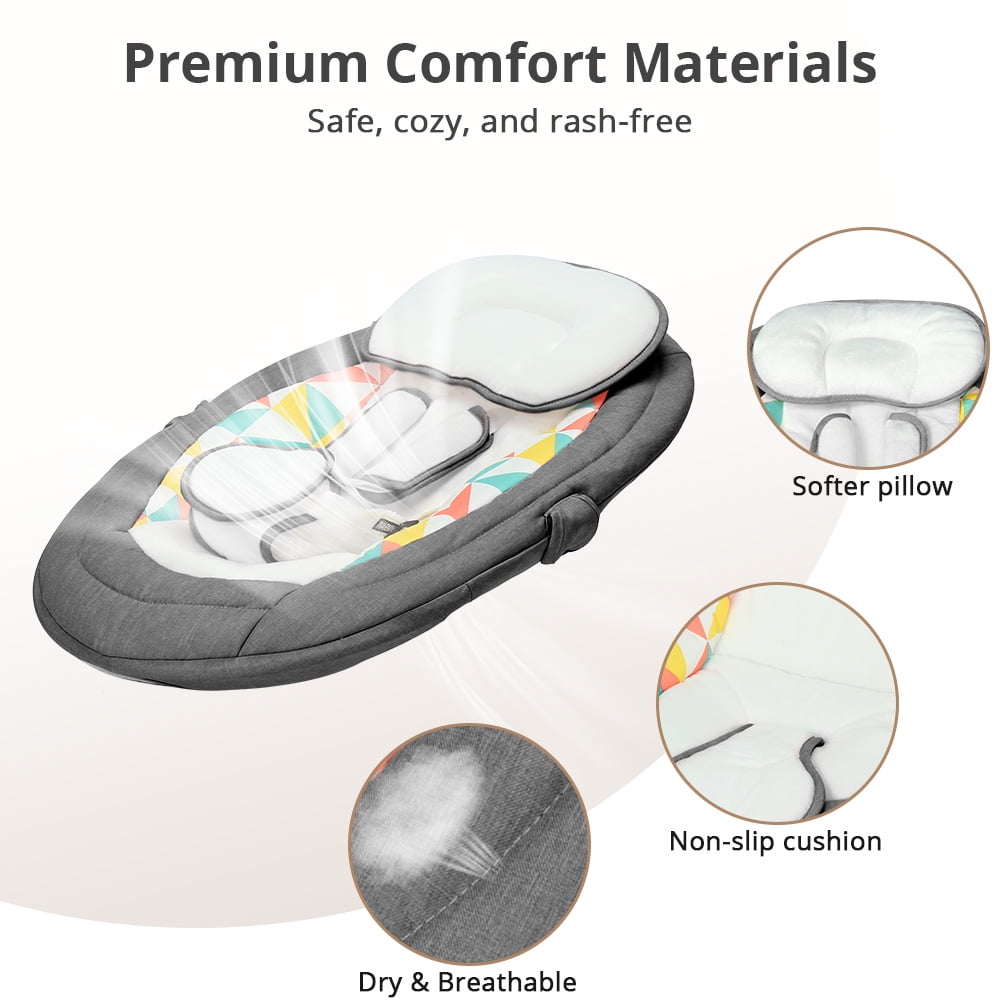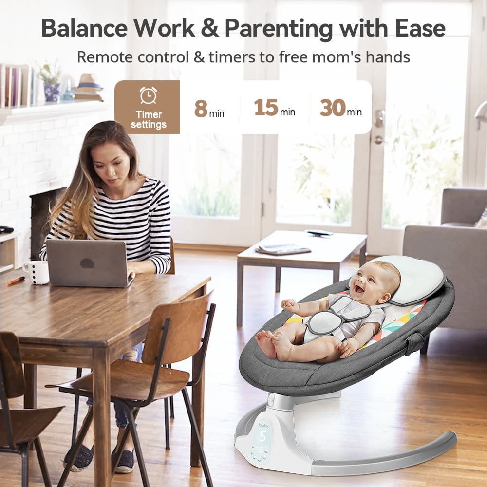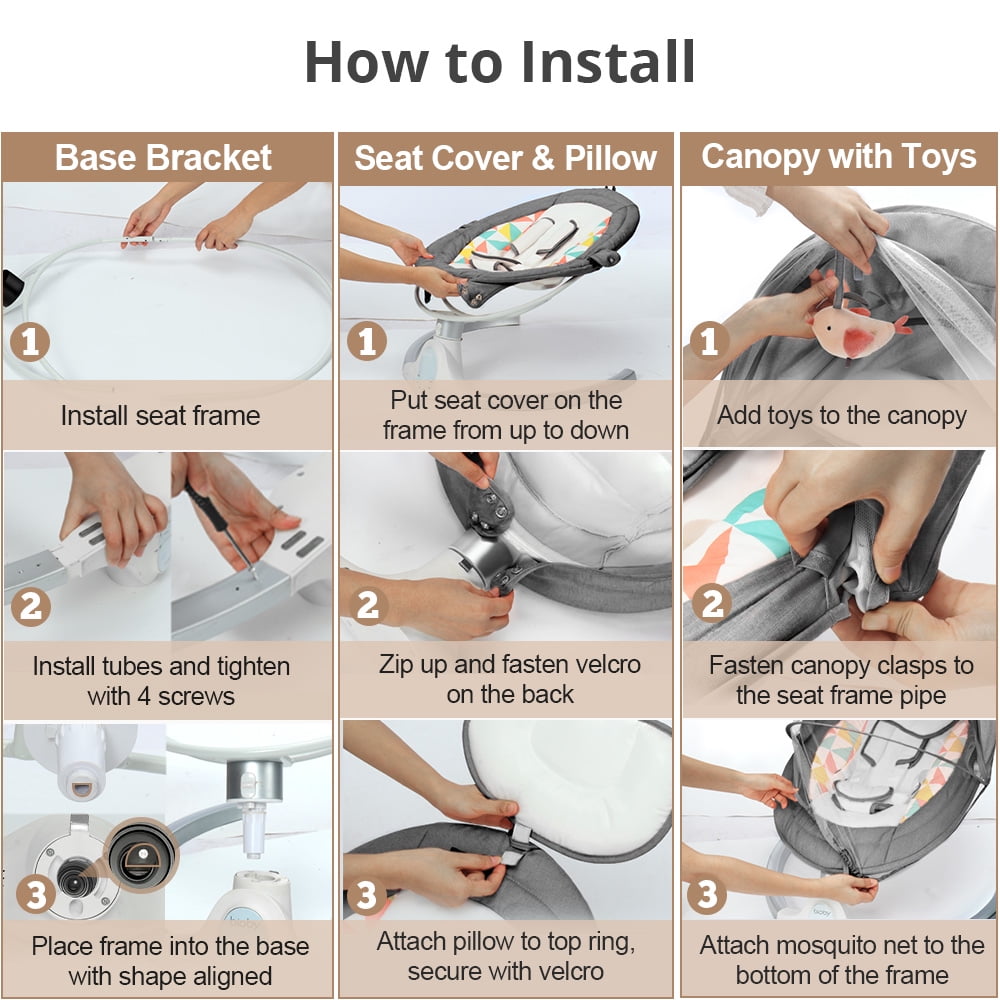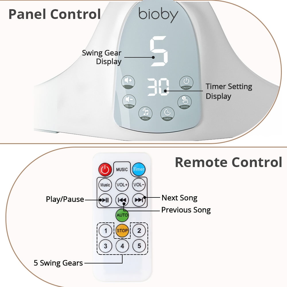 Key Features: Convenient Touch Screen& Remote Control The touch screen display is smart, intuitive and easy to use. Effortlessly operate the electric baby swing from a distance, allowing you to adjust swing speed, choose songs, and control other functions without disturbing your baby’s relax. 5 Speeds & 3 Time Settings The baby swing for newborn features a bionic design that mimics the parent’s arms’ natural side-to-side swaying, with 5 different swing speeds for your choice, including 18°, 21°, 23°, 25°,31°. When you are busy, you can also set the 3 different swing times: 8 / 15 / 30 minutes, which not only lets the baby peace and relax, but also lets the parents save the heart. 2 Hanging Toys& Mosquito Net This portable baby swing is very simple to put together and pack down, easy to store or transport, which includes a mosquito net and 2 hanging toys, protecting your baby and getting a better feeling. Bluetooth Play The baby swing for infants comes with a Bluetooth music player, built-in some preset songs. Enabling Bluetooth to control sounds and play your baby’s favorite music will calm your baby down. Premium Cushion& Frame The electric baby swing seat cushion is made of high-quality soft crystal velvet fabric, which is ultimately soft and breathable, and equipped with an adjustable belt harness, making your baby can enjoy ultimate comfort and safety at home. In another hand, the baby swings for infants’ base and frame provide a stable and sturdy structure, fit for babies weighing up to 24 pounds and aged 0-8 months.