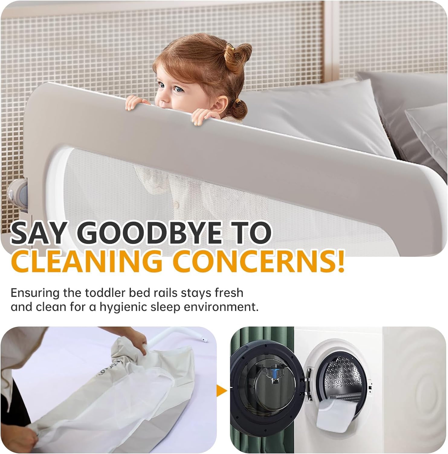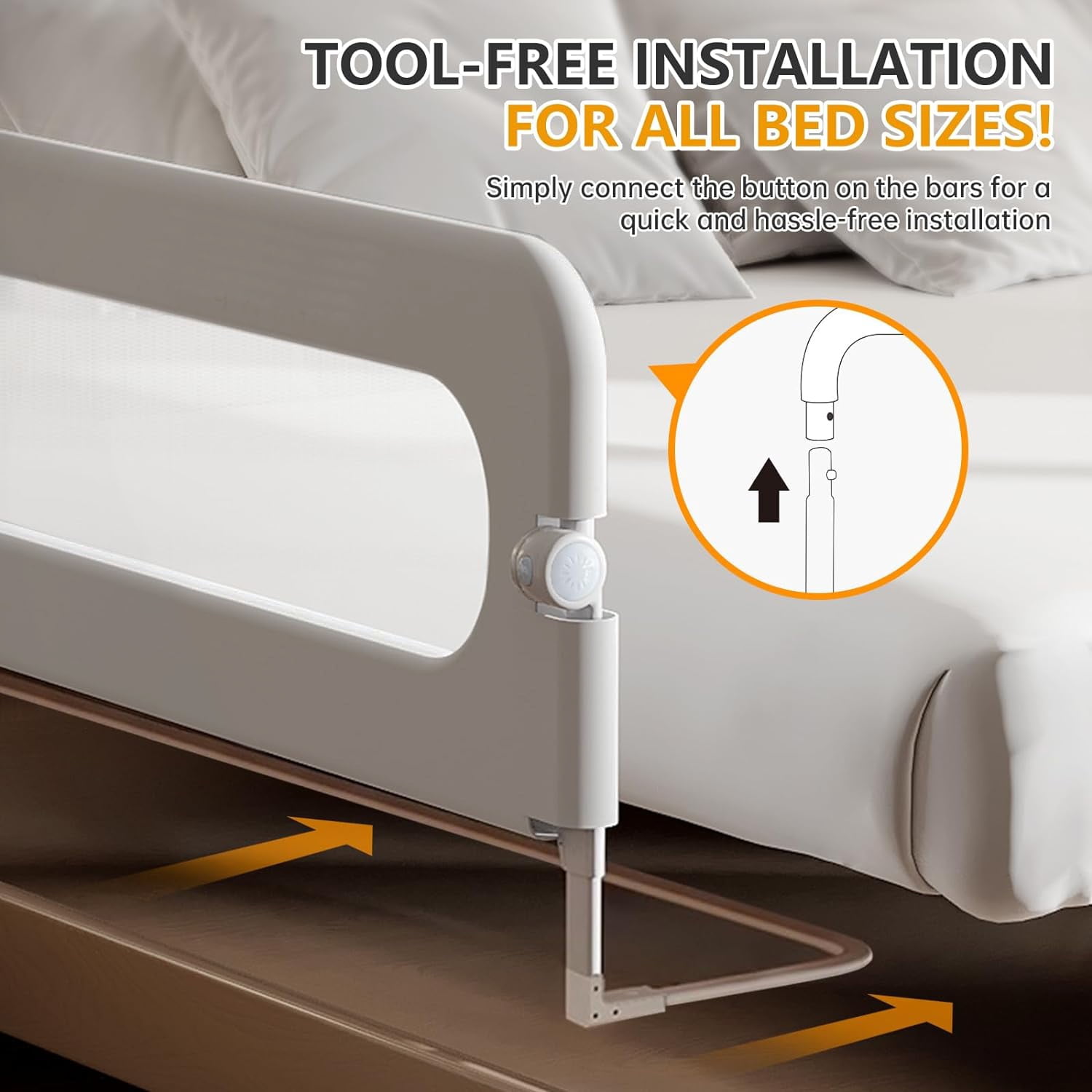 Foldable Toddler Bed Rails – Kids Guard Bumper for Crib Safe Bed Side Rail for Twin Queen King Full Size Beds Length:32inches 14 Speed adjustable-height for different thicknedd mattressAdjustable Height Range: 26″~31″ No Gap, Secure Design You can say goodbye to the worries of dangerous gaps between the bed and the fence. Our bed rail fits snugly against the mattress leaving no gaps! Strong Construction Our bed rails feature ultra-durable materials, ensuring longevity. Your child can bump into them countless times, and they won’t budge. Easy access Fold Down The convenient fold-down design makes it easy to get in and out of the bed! Non-Toxic Material It will not cause irritation or provide any discomfort, providing you peace of mind as your little one rolls on the bed.