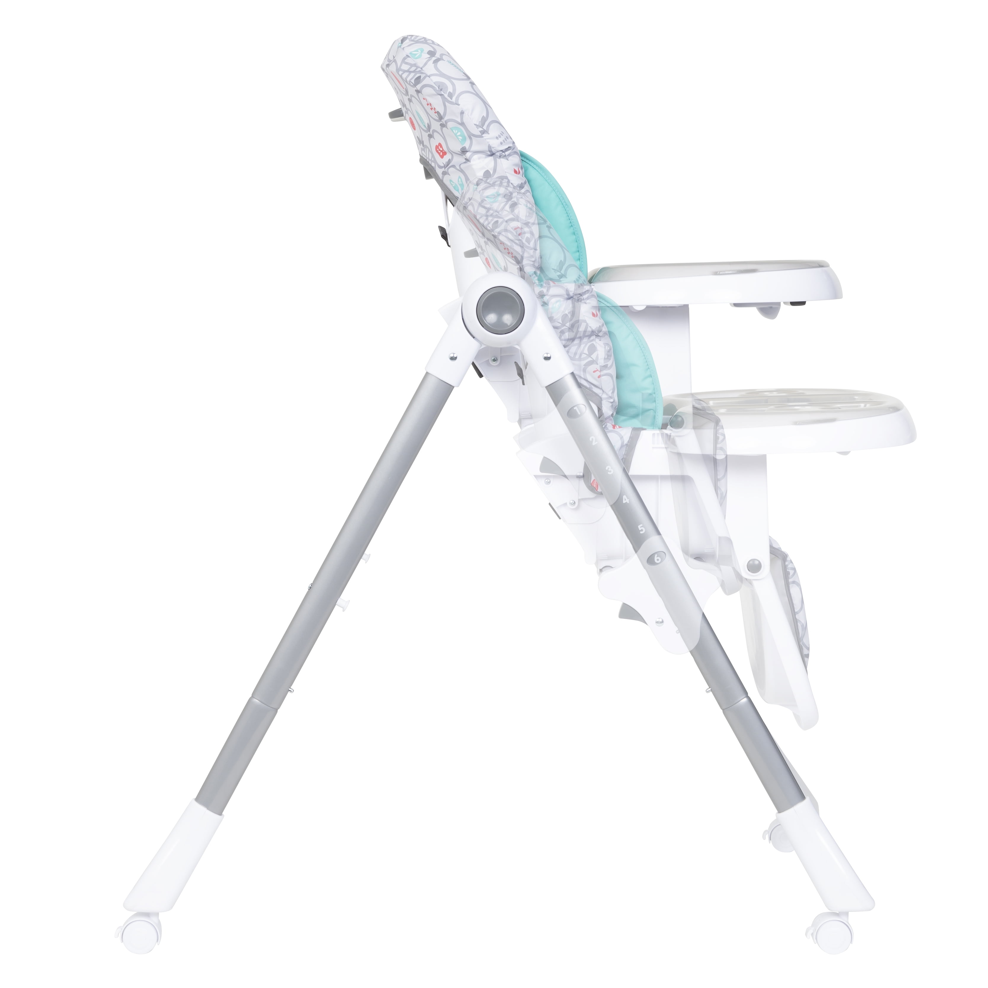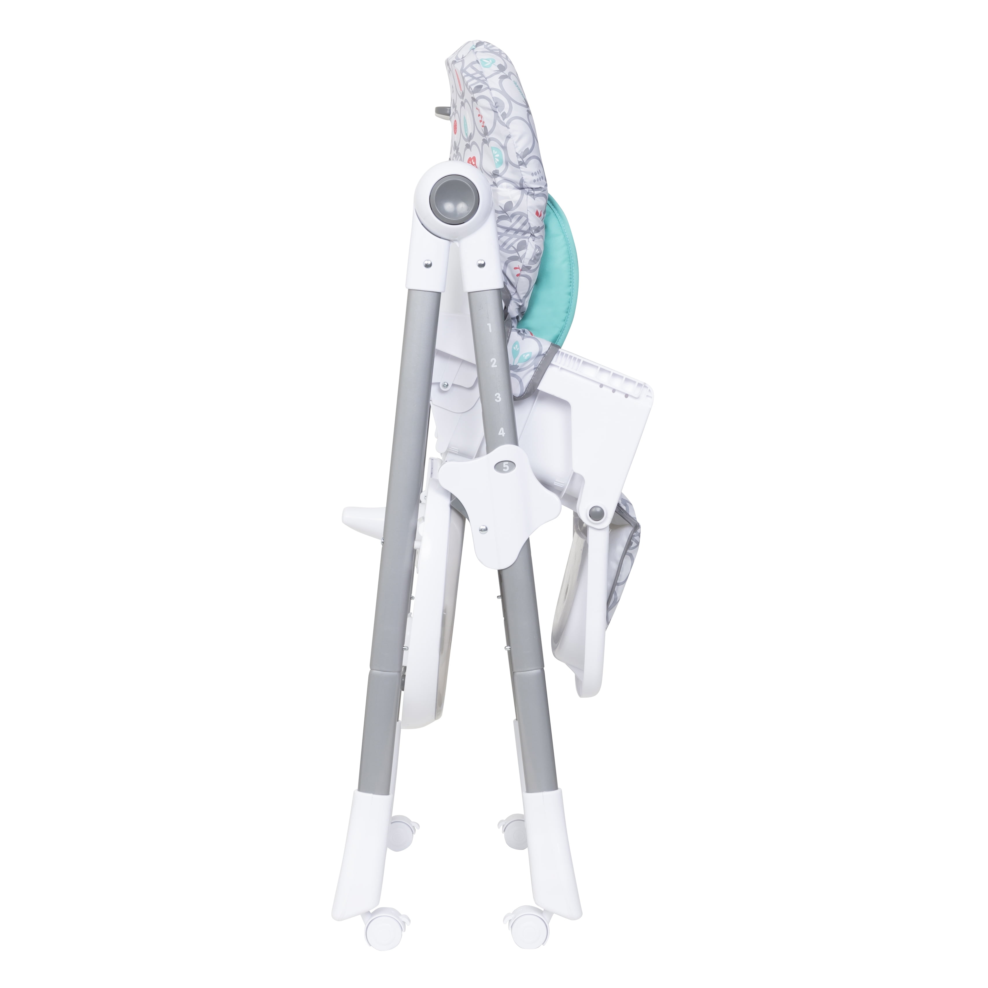 Enjoy meals at home or away with the convenient Baby Trend® Aspen ELX High Chair. The Aspen ELX High Chair features a 3-position seat recline and a 6-position height adjustment. To keep your child secure during meal time, the Aspen ELX High Chair has a 5-point safety harness with harness covers for elevated comfort. A dishwasher-safe tray is included and can be conveniently stored on the lower frame of the high chair when not in use. For stability, large caster wheels with brakes can be locked in place, and unlocked to easily be moved from room to room. This Aspen ELX High Chair is recommended to use for toddlers who can sit upright unassisted up to 40 pounds. The bright colors make for a gender neutral fashion, and makes any room pop.