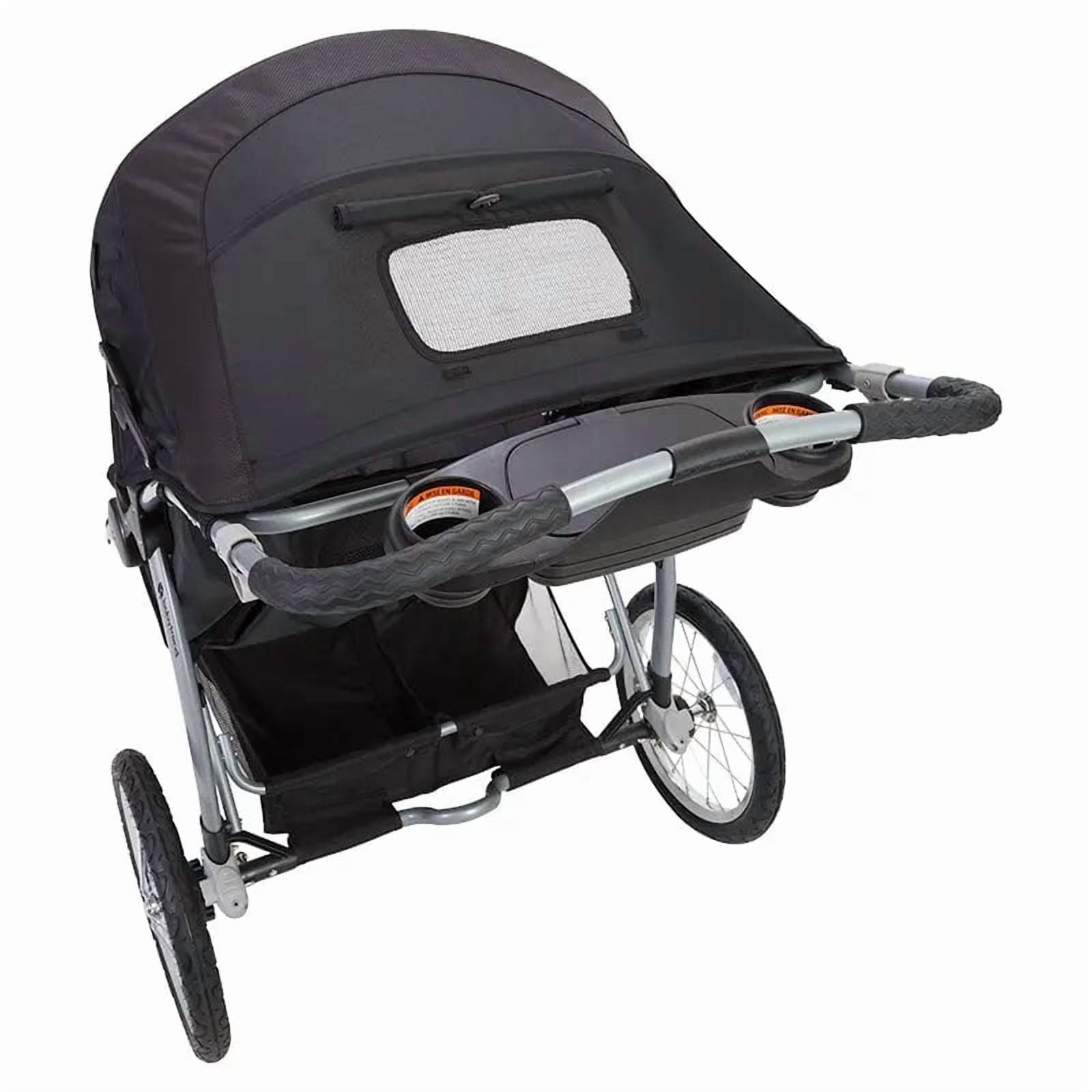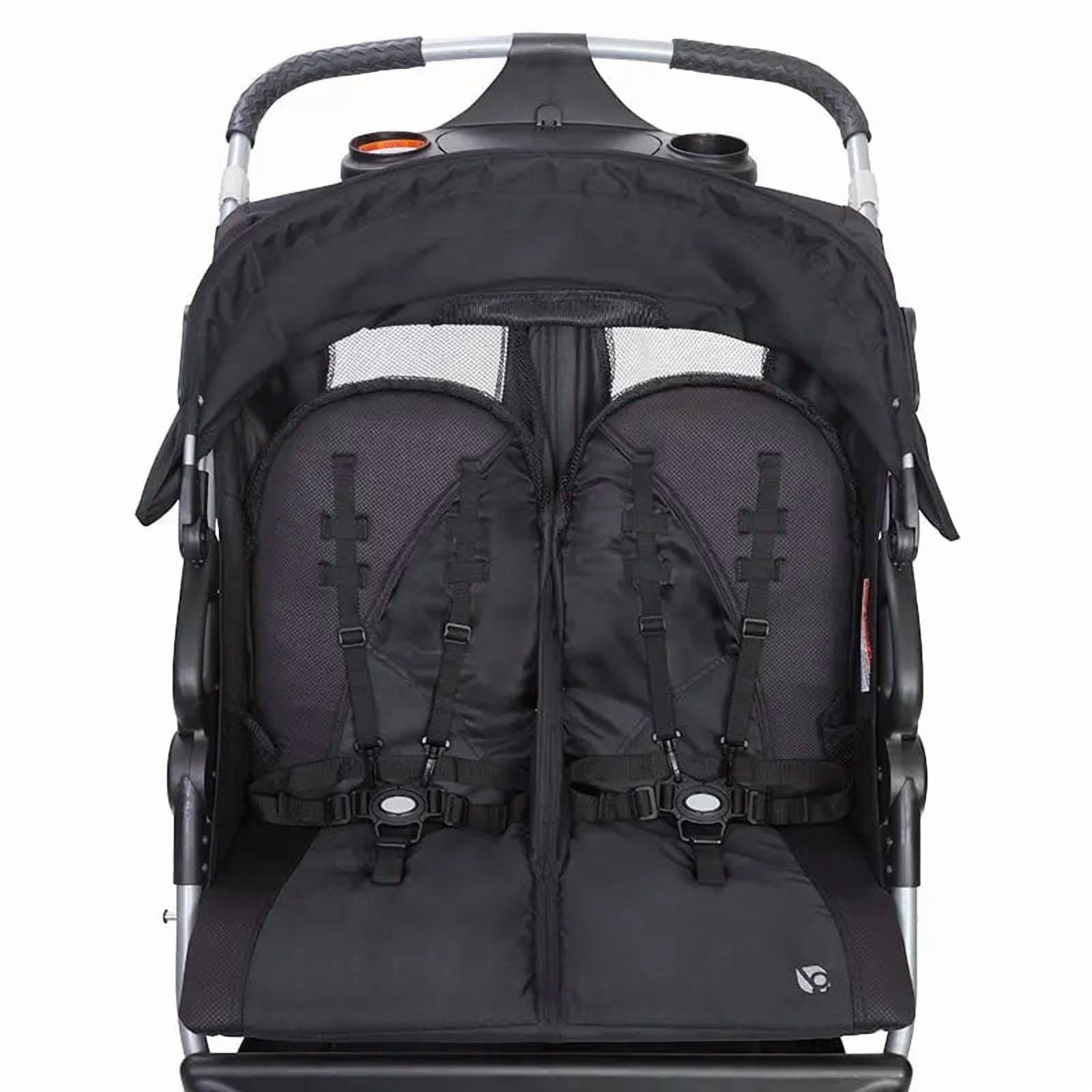 Take your family jogging with the Baby Trend® Expedition® Double Jogger. Made for two children, this jogging stroller features bicycle tires and a locking front swivel wheel that allows you to keep the front wheel in place while jogging. If you’re out for a leisurely stroll, simply unlock the front wheel for greater maneuverability. For your convenience, the parent tray includes two cup holders and covered compartment storage. For your children’s comfort and safety, the double jogger features a ratcheting shade canopy, a multi-position reclining seat and adjustable five-point safety harnesses. Store your children’s necessities in the large storage basket and you’re ready to roll. Know you’re traveling safely in this sturdy, lightweight double jogger that’s certified by the Juvenile Products Manufacturers Association. At the end of your trip, quickly and easily fold the stroller into a compact unit.