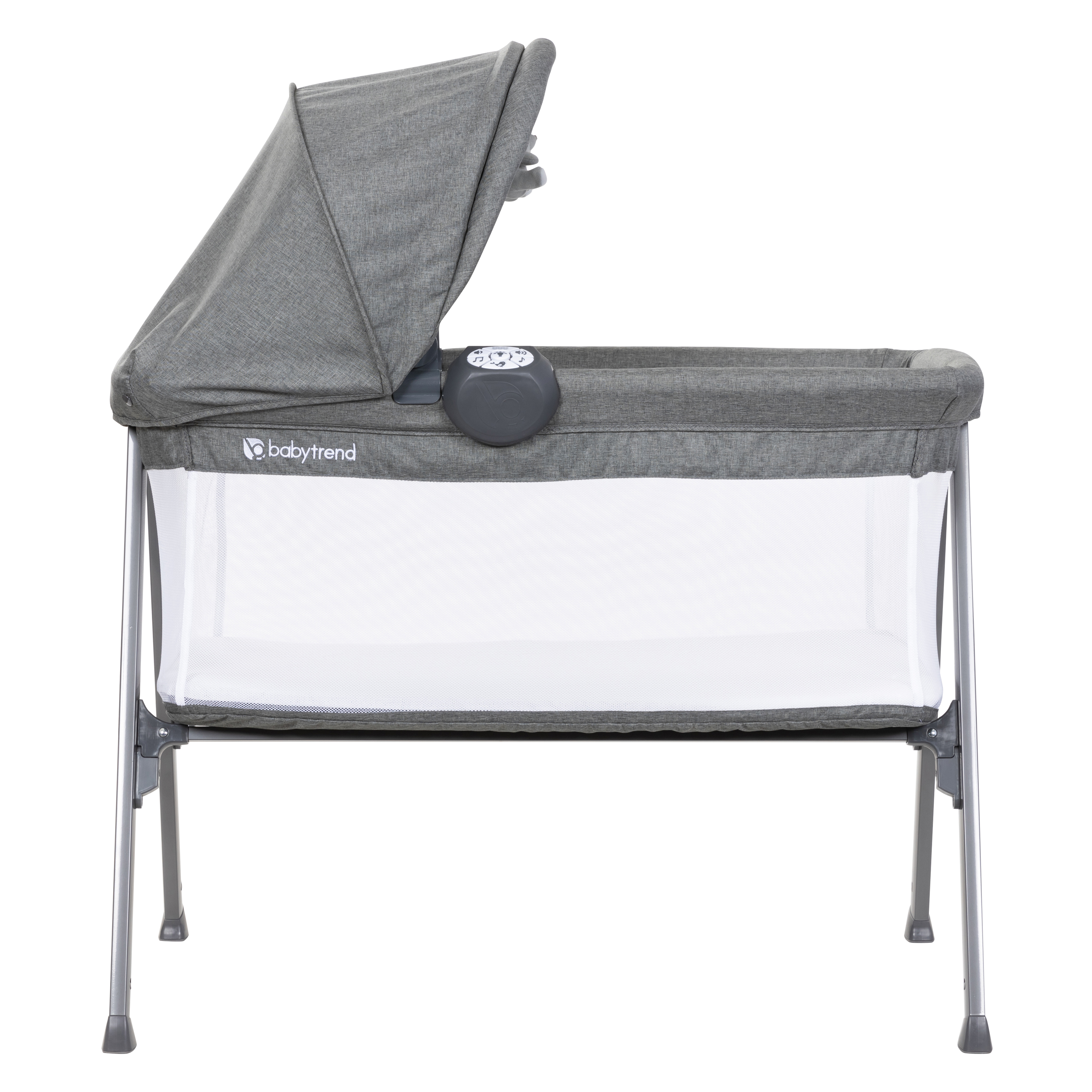 A full-size bassinet with airflow mesh sides provides comfort and breathability for your baby This standalone bassinet allows your baby to easily be with you at all times A removable and washable mattress allows for easy and hassle-free cleaning Thick, steel legs provide sturdiness and stability to ensure there will be no bumps in the night for your little one The narrow frame fits through doorways for easy portability around the house Quick and easy assembly for hassle-free set up whether at home or on the go! The canopy with hanging plush toys will encourage movement from your baby until they are able to fall asleep IC unit offers vibration, a nightlight, and a variety of melodies to gently soothe your baby to sleep Included travel bag makes on the go plans a breeze!