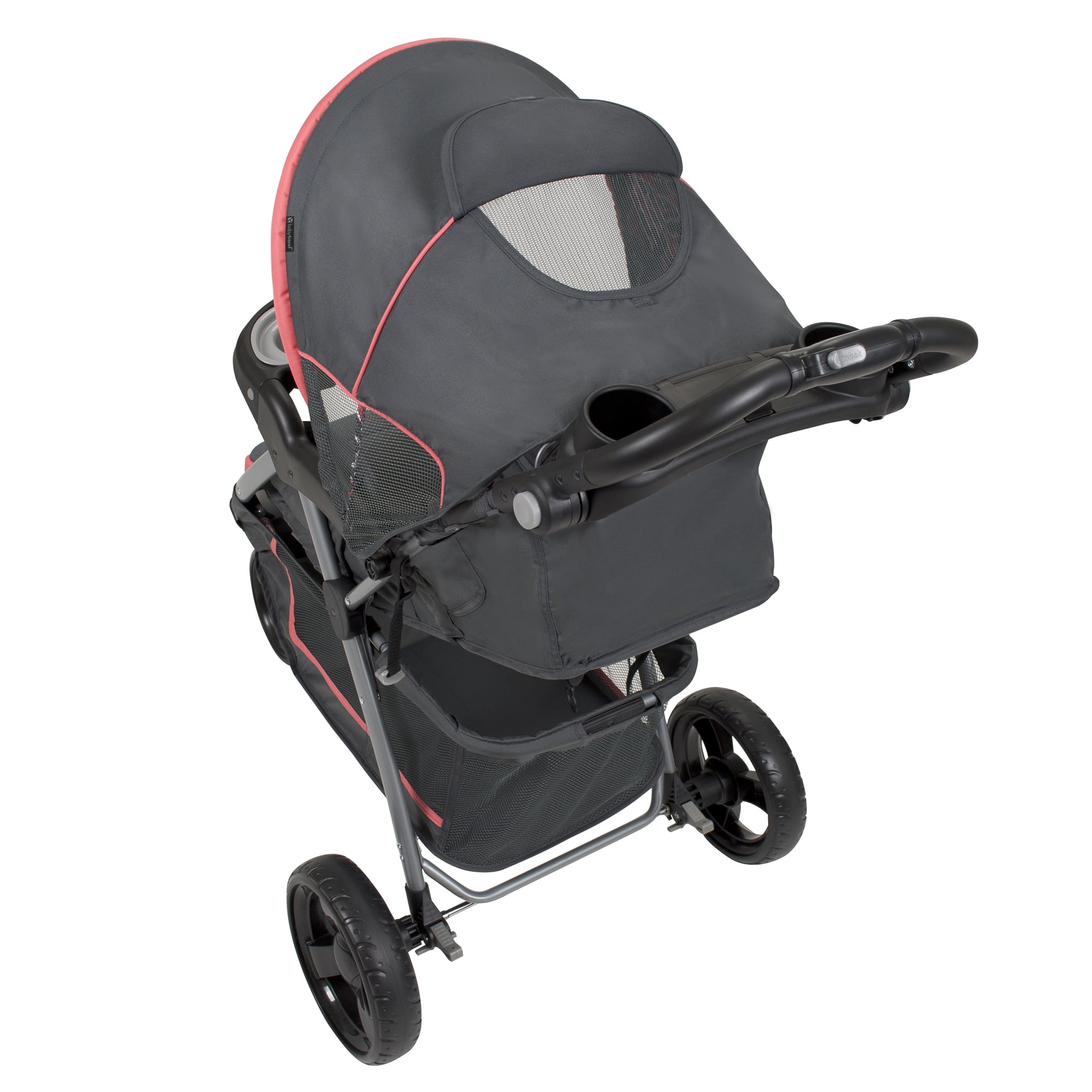 Baby Trend Nexton Travel System Stroller, Floral Pink 1 hand fold Large lower storage basket Compact fold Covered parent tray with 2 deep cup holders Large soft head support for the car seat or the stroller Height adjustable handle Multi-position reclining seat, 5-point safety harness with padded harness covers Baby stroller travel system includes EZ Flex-Loc infant car seat and base Child tray with cup holders