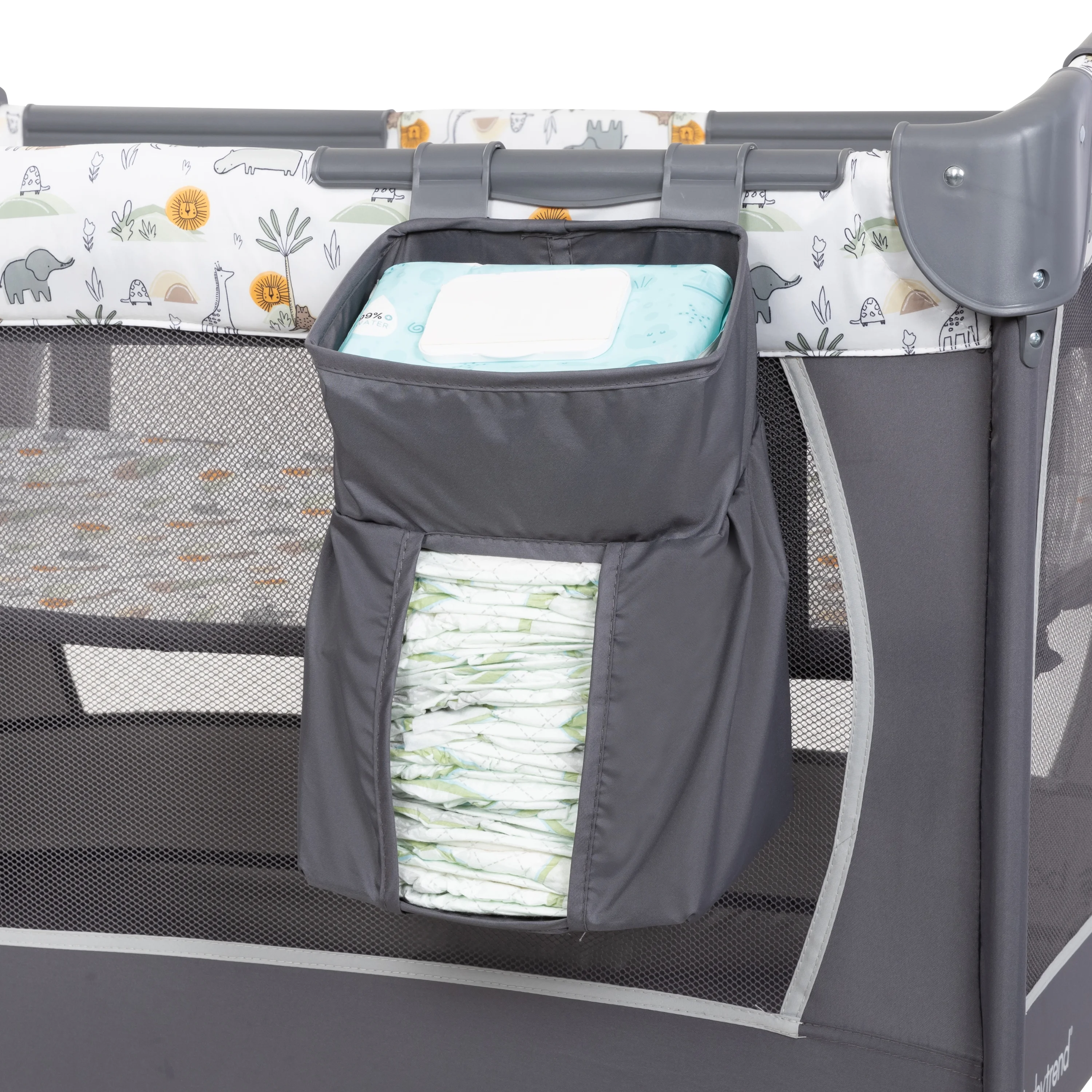 Removable Baby Trend lay-flat full bassinet Enhances eye-hand coordination with 3 adorable toys to reach, bat, and grasp Diaper stacker Travel/storage tote bag