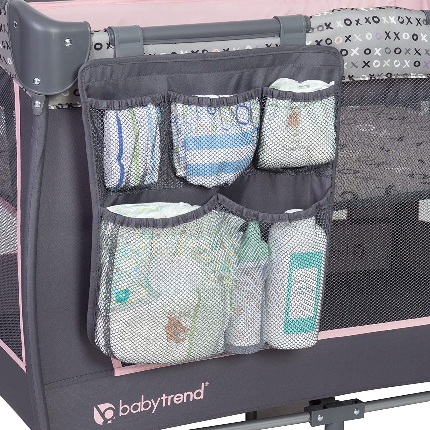 Your little one will enjoy the world from the comfort of the Trend-E Nursery Center from Baby Trend. The full-size bassinet provides a secure and comfy environment for your infant to rest and recharge. Keep essentials close in the mesh parent organizer and remove it when not in use. As your baby grows, the nursery center becomes the ideal playtime center and the large wheels with brakes provide added mobility and stability. The nursery center folds compact and easily fits into the included travel/storage bag for convenient portability. The pink fashion is girly and will fit in any room. Recommended usage is from birth to 30lbs or 35″.