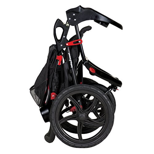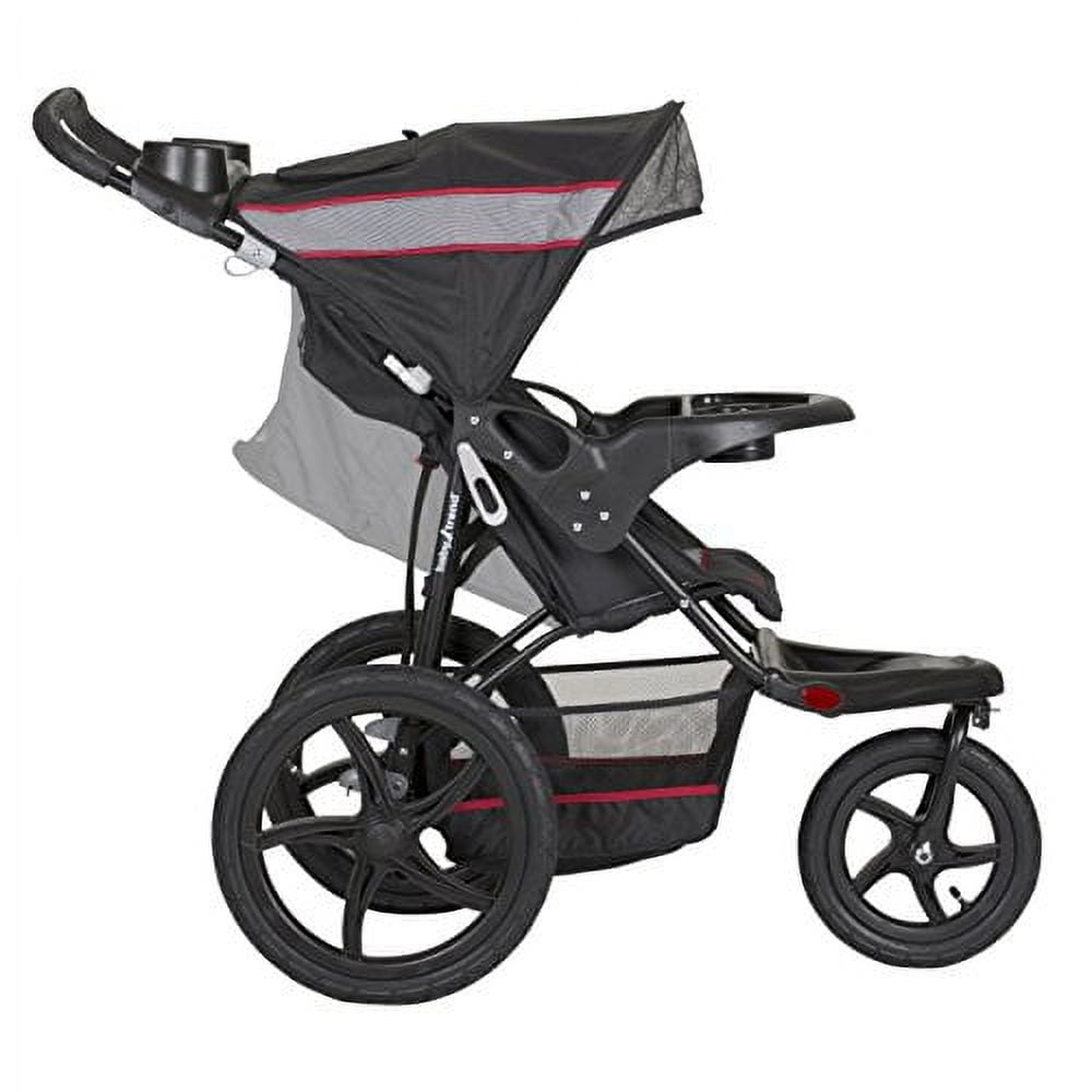 The Baby Trend® Range Jogger combines comfort and convenient features for active families. With all terrain wheels, this jogger provides excellent maneuverability and stability. The locking swivel wheel allows you to lock the front wheel in place when jogging and unlock it for easy low speed strolling. Two deep cup holders and a covered compartment are handy additions for parents. The seat includes a 5-point harness with padded covers to secure your child in place and an expandable canopy to protect from harmful sun exposure. When resting, park the jogger with the foot activated, dual rear brakes. Effortless trigger-fold easily reduces this jogger to compact size for storage and portability. Create a travel system by adding a Baby Trend infant car seat (sold separately).