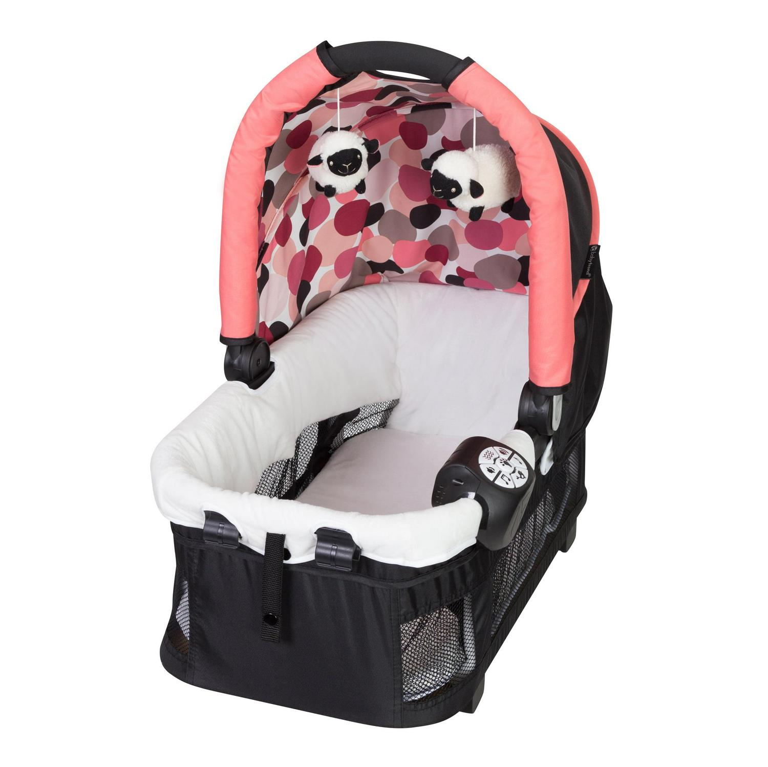 – Removeable Baby Trend Rock-A-Bye lay flat Bassinet with 2 toys converts to a stand alone rocker