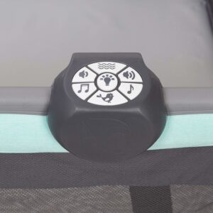 The Baby Trend Retreat Nursery Center playard features a Removable Rock-A-Bye Bassinet (zero incline) with a canopy and carry handle, plush fabric and mesh sides for proper ventilation, and 2 toys. The playard includes a removable full lay flat bassinet, changing table, and a deluxe parent organizer. Easy one-hand locking mechanism makes the playard stable and it can be moved from place to place with large wheels and secured with brakes. Also included is a convenient travel/storage tote bag. Your baby will enjoy the electronic music center with volume control, nightlight, and vibration. Included are two styles of music and nature sounds. This playard is recommended for babies from birth to 30lbs.