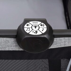 – Nursery center with plush fabric lining includes electronic music center with volume control, a nightlight, and vibration with 2 styles of music and nature sounds