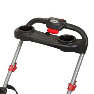 - Removable swing away child tray with cup holder which can be used on either front or back position