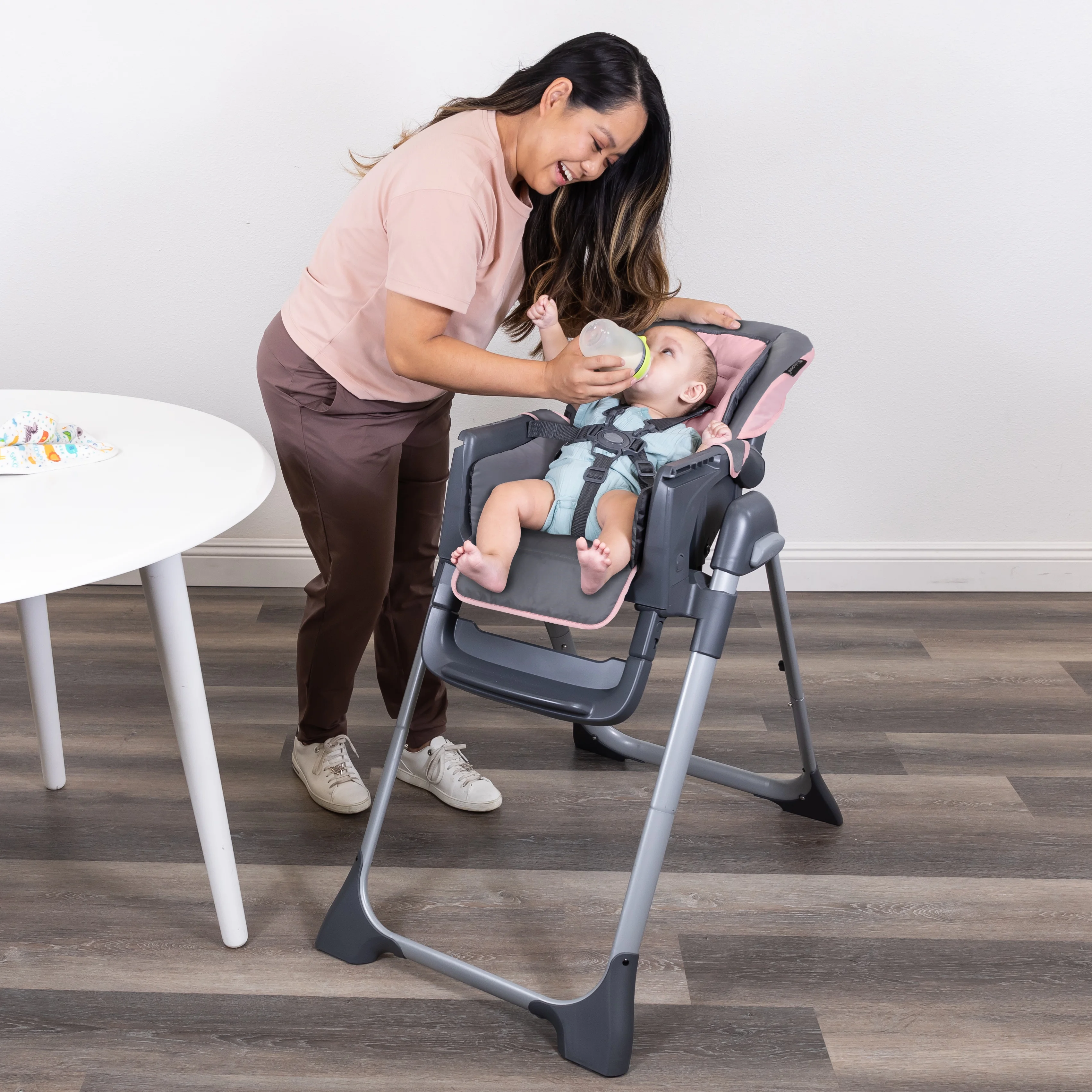 3 Modes of Use: Infant High Chair (in reclined seat position) Traditional High Chair and Toddler Chair (Tray removed and in lowest position) Streamlined and modern design with less nooks and crannies for crumbs to hide Seat recline 3 positions, 3-Position one hand operated tray Dishwasher-safe removable tray Multiple position height adjustment Adjustable 5-point safety harness system Folds compact for storage, Recommended usage is from sit upright unassisted up to 40lbs Cozy pink color is cute and perfect for your little girl