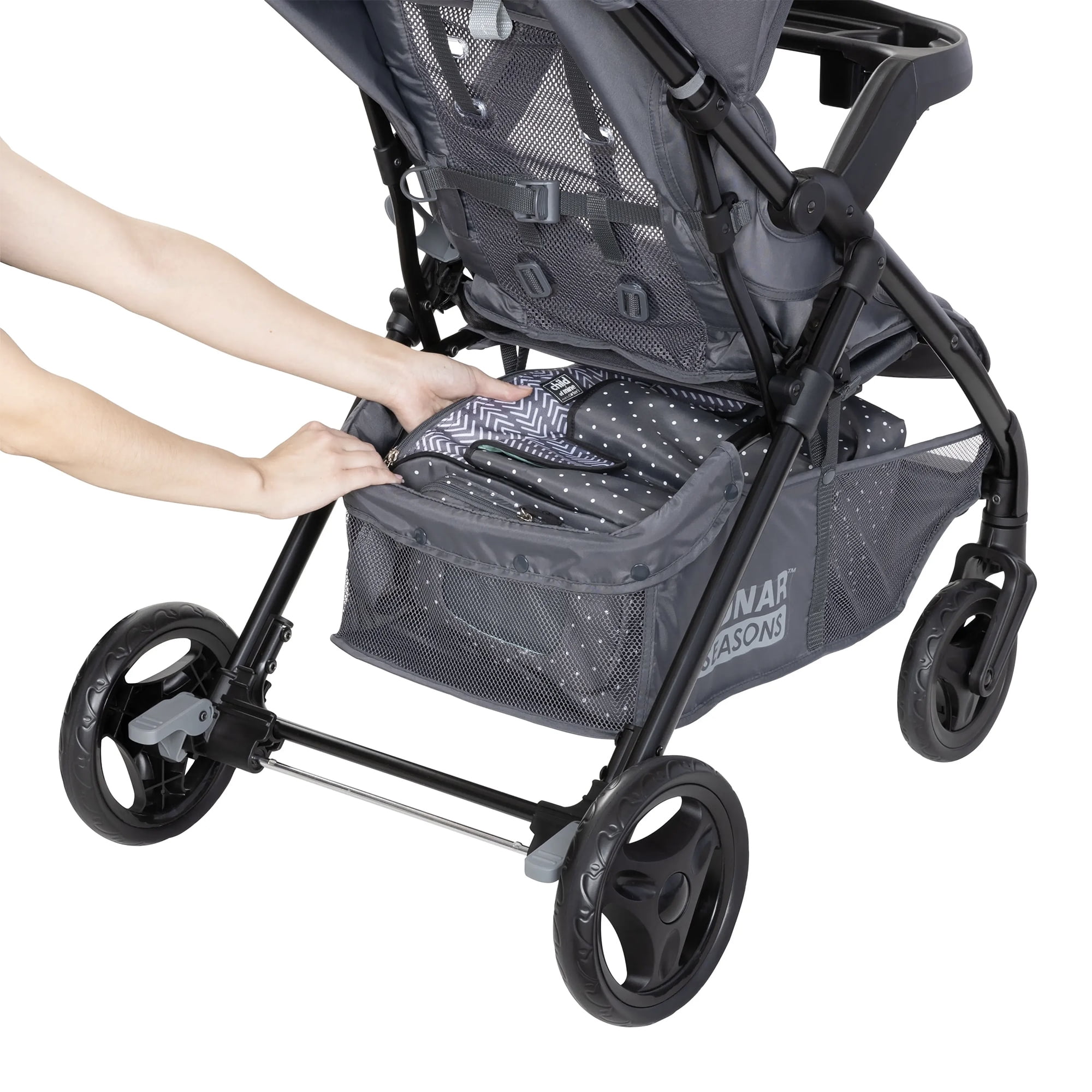 Whether it’s Winter, Summer, Spring or Fall — strolling is a breeze with the Sonar Season Travel System by Baby Trend. This unique stroller can convert from a traditional backrest to a breathable, mesh backrest by rolling the seat back up. Once it is rolled up, the seat back can be used as a pillow or it can be stored behind the stroller seat. The Sonar Seasons has a large basket that has both front and rear access, as well as a parent tray and child tray with cup holders and storage.