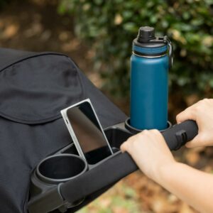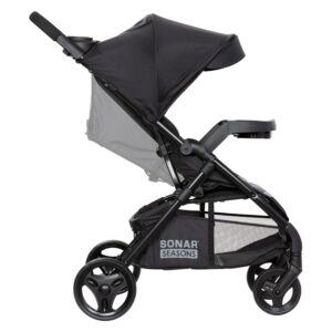 Whether it’s Winter, Summer, Spring or Fall — strolling is a breeze with the Sonar Season Travel System by Baby Trend. This unique stroller can convert from a traditional backrest to a breathable, mesh backrest by rolling the seat back up. Once it is rolled up, the seat back can be used as a pillow or it can be stored behind the stroller seat. The Sonar Seasons has a large basket that has both front and rear access, as well as a parent tray and child tray with cup holders and storage. Item weight is 32 lbs and includes a 5-point harness.