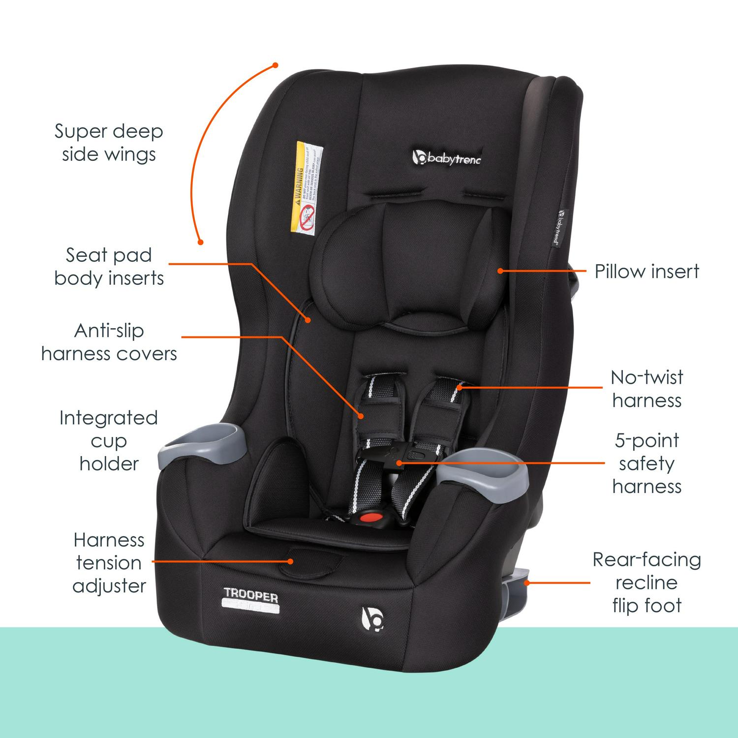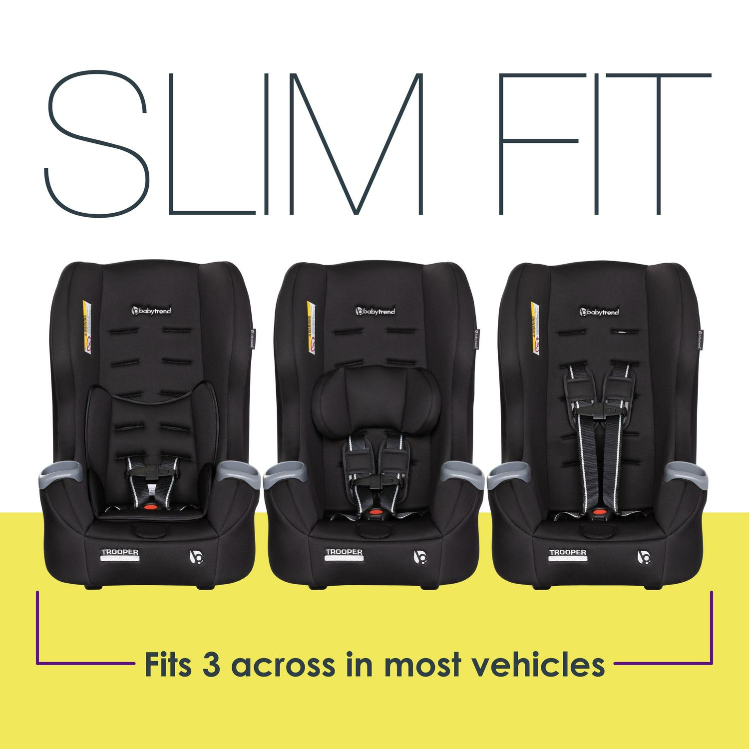 The Baby Trend Trooper 3-in-1 Convertible Car Seat converts from rear facing infant seat (4-18lbs) and rear facing toddler seat(18-40lbs), to forward facing toddler seat (22-65lbs) as your child grows. With 5-position shoulder height adjustment and 3- position crotch buckle for seat adjustment, the Trooper convertible gives parents the ultra convenience for installation and adjustment. The rear-facing recline flip foot also allows the Trooper to get great installation angles with ease. Trooper’s nimble frame can fit three across in most vehicles which is great for families that have more than one kiddo. The lightweight shell also allows for use of LATCH installation up to 55 lbs. The super deep side wings offer better side impact protection and premium cushion, giving your babies great head protection and support. With premium fabric and two convenient integrated cup holders, our Baby Trend Trooper 3-in-1 Convertible Car Seat truly gives your children the most comfortable and convenient commute/travel experience.