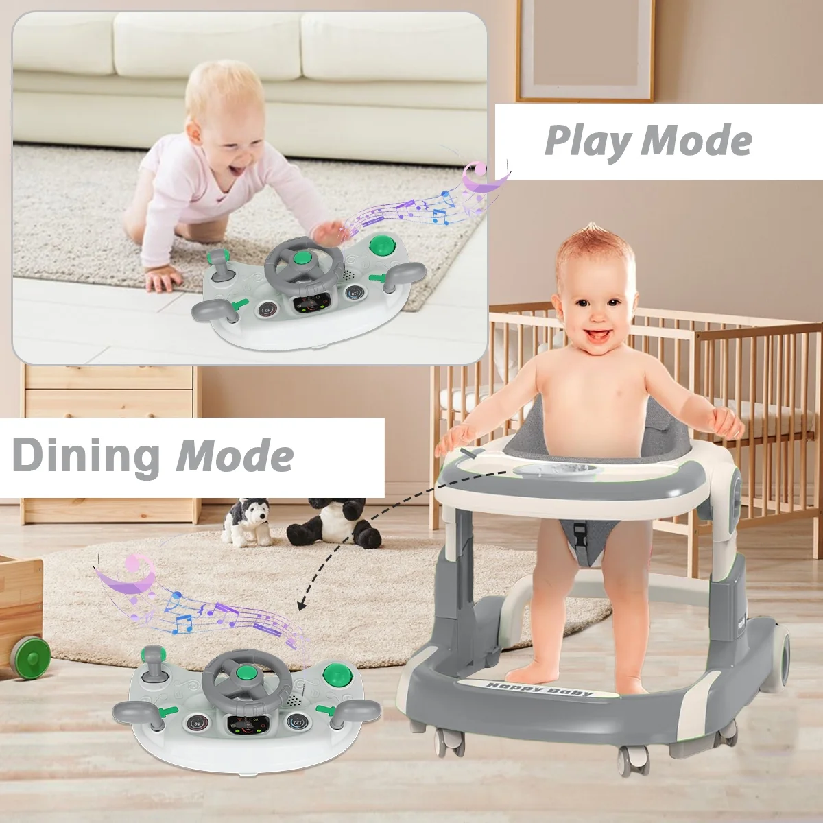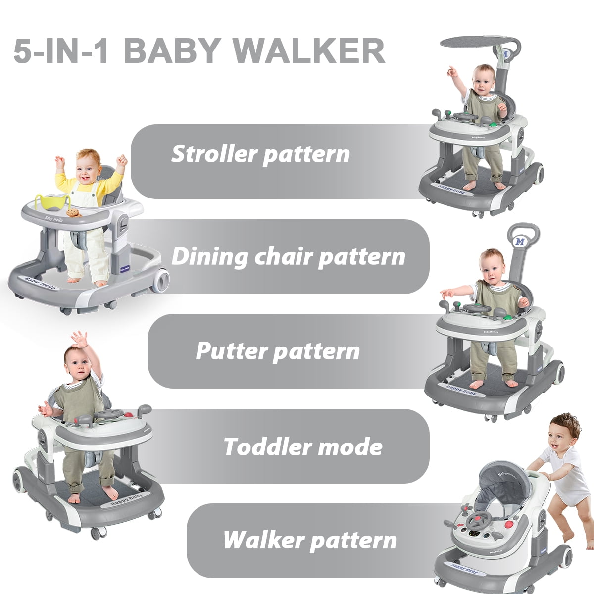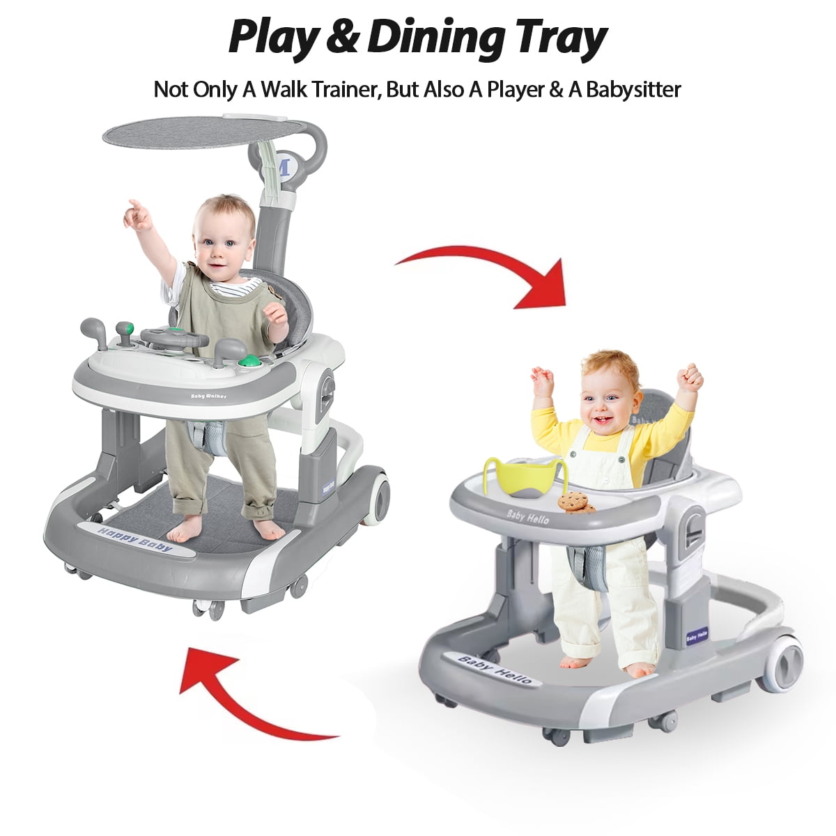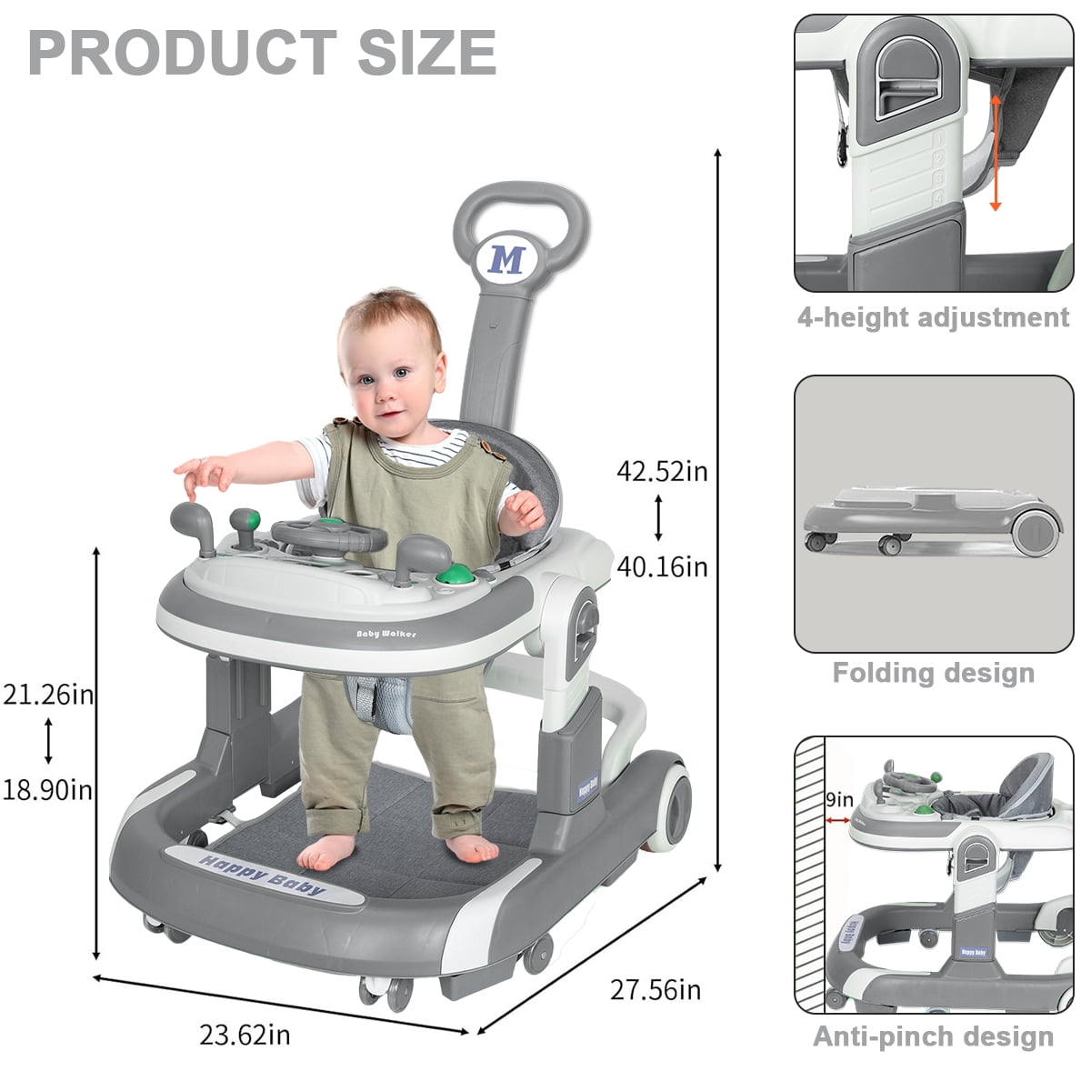 Car-Themed Design Ignite your child’s imagination with our car-themed walker, equipped with a multi-functional steering wheel toy featuring engaging music and lights.Whether indoors or outdoors, our 3-in-1 Transformable Baby Walker is a delightful companion for your child’s exploratory journey, making each step a memorable adventure. 3 Transformable Modes Seamlessly transition between Baby Activity Center, Walking Mode, and Adult-Push Stroller Mode to suit your child’s growing needs. Safety-First Design The anti-tip technology, silent wheels with adjustable speed, and a secured height and angle adjustment ensure a safe and comfortable exploration. Meal & Play Tray Easily detach the steering wheel toy to reveal a convenient tray for meals or other activities.Outdoor Ready The inclusion of a push handle and sunshade allows for enjoyable outdoor activities with your child. Comfort and Convenience With its foldable design, 4-level height adjustment, angle-adjustable car body, elastic foot pads, and breathable linen cushion, this walker offers utmost comfort and ease of use.Preventive Measures The thoughtful design aims to prevent O-legs, features anti-slip and silent wheels ensuring a smooth and quiet ride. Material: Carbon Steel Polypropylene-PP Design: portable,Multifunction, Type: Baby Walker Color: more colors for choice Style: casual Packing: 1 piece