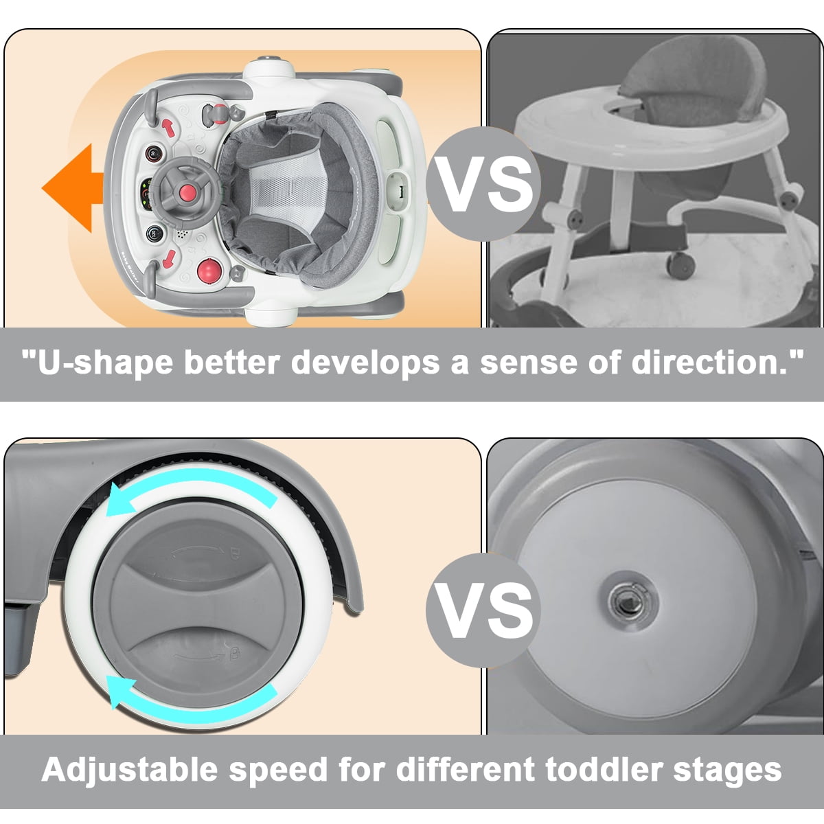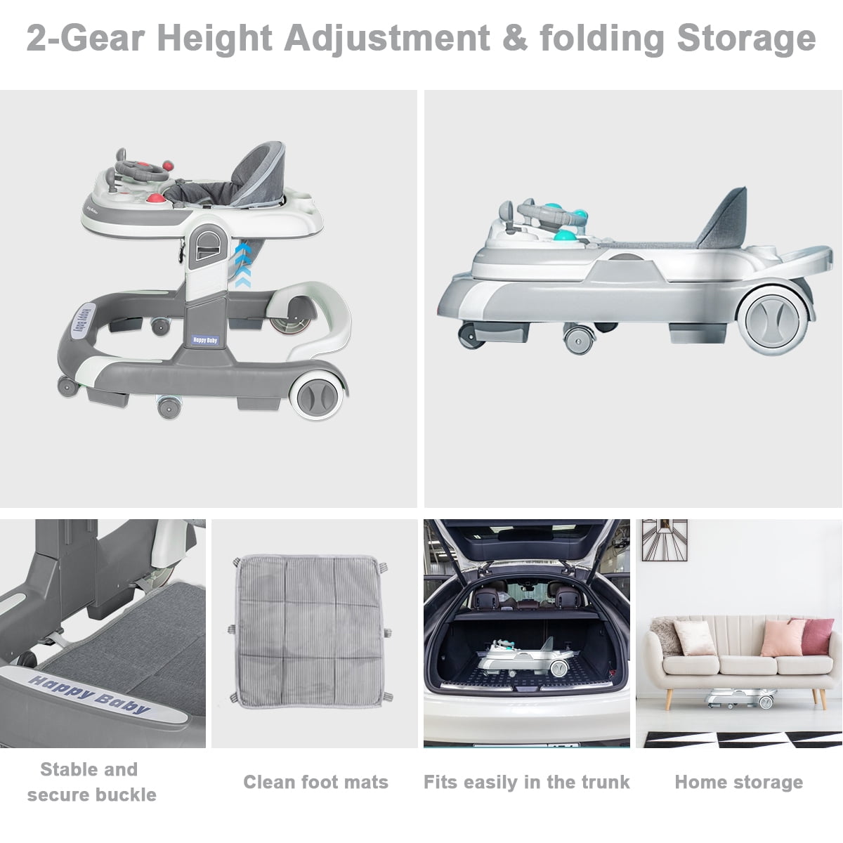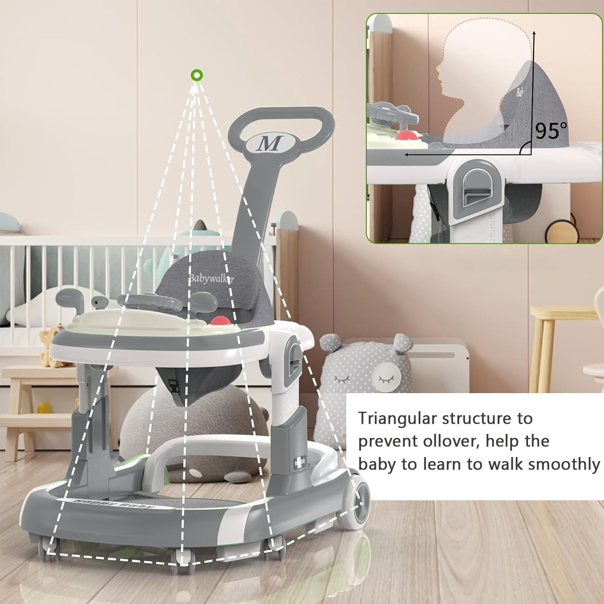 This baby walker has three different modes – a walker, a push walker, and a push car, the walker can adapt to your baby’s needs as they grow and develop.Designed with a spacious base, the baby walker provides ample room for your little one to learn to walk comfortably.To accommodate your baby’s growing legs and prevent “O”-shaped legs, we designed the walker with four height adjustment settings.With your baby’s safety in mind, our baby walker is equipped with a safety bumper beneath the seat. When the baby moves backward, the bumper acts as a buffer.The foldable design of our baby walker makes it ideal for storage or travel. It can be easily folded and conveniently stowed under the bed or placed against the wall without taking up much space.