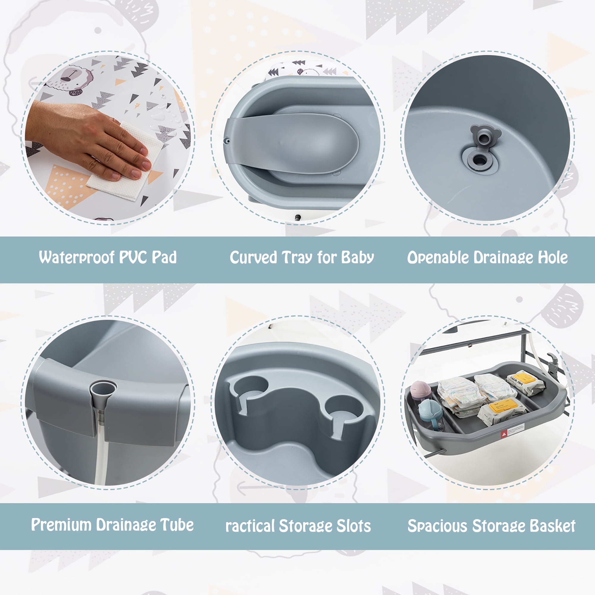 Save your back with this baby changing table with bathtub! With a practical bathtub, this baby changing station is designed for versatility. It is suitable whether you use it to change diapers for your baby or bathe your baby. And the storage slots as well as the storage basket will hold baby’s essentials for easy access. In addition, the reasonable height can effectively relieve your back pains from bending too much. Also, the thoughtful drainage system makes water drainage an easier thing. When you do not need to use it, you can fold the diaper changing station and store it in the corner to save space. Feature Use it to change diapers, bathe or massage your baby The proper height avoids bending frequently and saves you back Fold it easily for a perfect storage solution 4 universal wheels with brakes for smooth moving and added safety Sturdy construction with solid steel frame Waterproof PVC top pad for easy cleaning Curved tray for baby and storage slots for toiletries Considerate drainage hole and tube for easy water drainage Spacious storage basket holds baby’s belongings Suitable for kids aged 0 to 12 months Specification Color: Gray Material: Steel, PP, PVC Dimension of Unfolding: 34” x 20” x 41” (L x W x H) Dimension of Folding: 33” x 13” x 36” (L x W x H) Net Weight: 23 lbs Weight Capacity of Bathtub: 33 lbs Weight Capacity of Storage Shelf: 15 lbs Recommended Ages: 0 – 12 Months Package Includes: 1 x Baby Changing Table 1 x Instruction