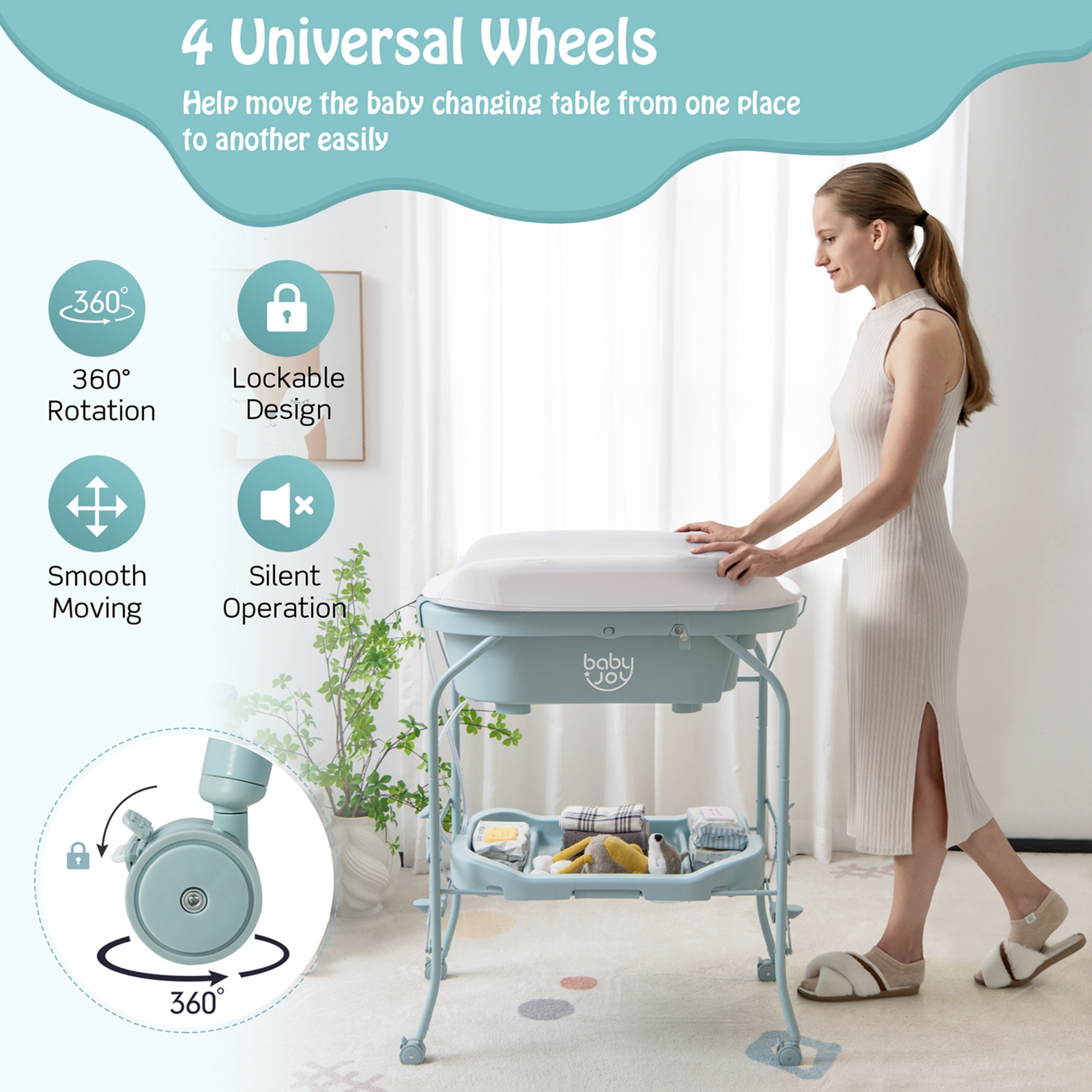 Multipurpose Baby Changing Table: This baby changing table with bathtub allows you to use it to change diapers or clothes for your baby, massage and nurse your baby. By removing the changing pad, you can bathe the baby with the bathtub. Moreover, the large storage basket holds baby’s belongings for easy access. Waterproof & Convenient Changing Pad: The changing pad (weight capacity: 24 lbs/11 kg) is water resistant for easy cleaning. By the way, the cute patterns add much fun. More importantly, the changing pad can be flipped over and fixed with the buttons, which is space-saving when not in use. Humanized & Thoughtful Bathtub: This bathtub (23” x 13” x 8”/58 x 32 x 20 cm) has a curved tray for your baby and 2 practical storage slots for bathing essentials, holding up to 33 lbs/15 kg. Meanwhile, the openable drainage hole pluses the premium drainage tube allow water to flow down, avoid getting up frequently to pour water. Durable & Sturdy Construction: Made of high quality PP material, this diaper changing station is built to last. Moreover, the baby changing table is firmly supported by sturdy metal frame for a steady performance when in service. Movable & Foldable Design: The diaper changing station is equipped with 4 universal wheels that will help move it from one place to another easily. Also, all 4 wheels can be locked for extra stability and safety. What’s more, you can fold the diaper changing station within several steps for convenient storage.
