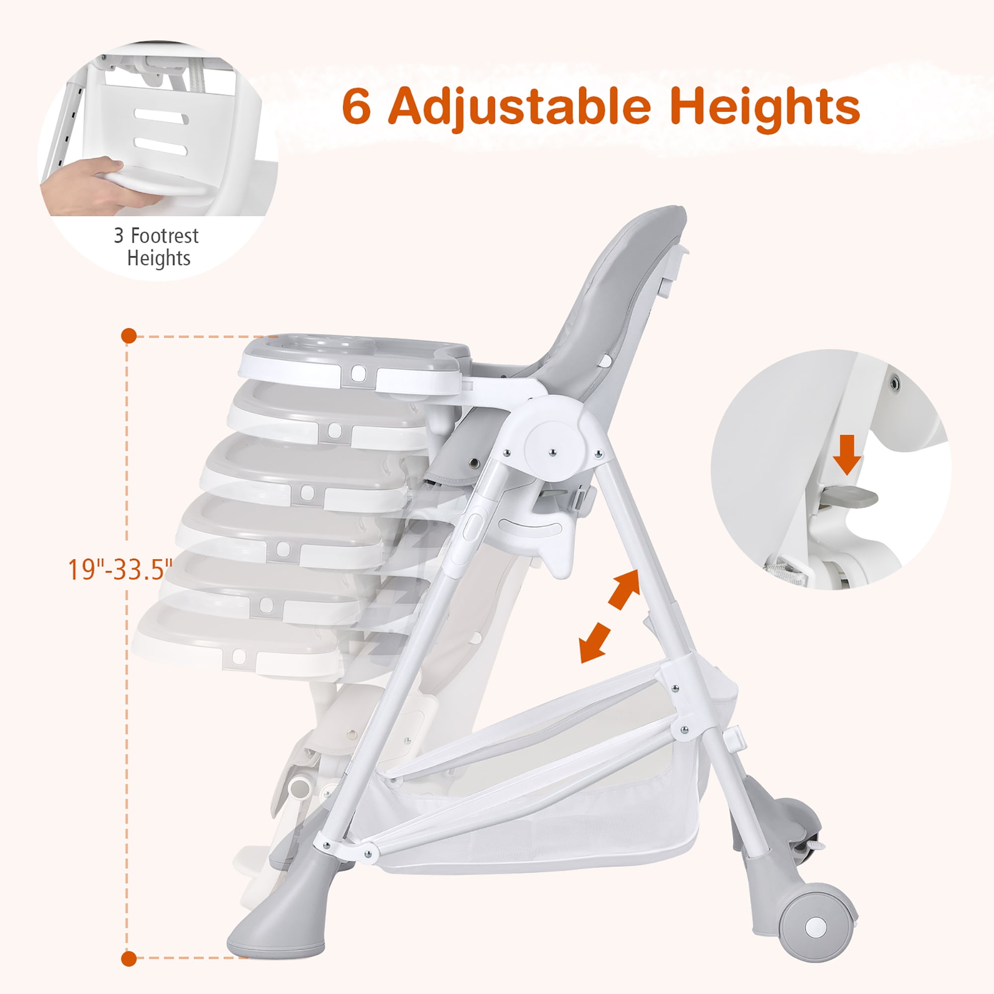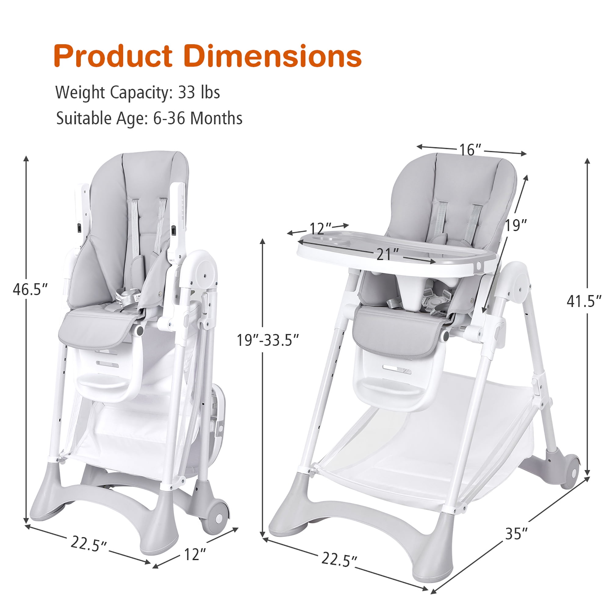 This foldable baby high chair is a perfect gift for your baby! Our high chair features 5 recline positions from 105° to 165°, 3-position footrest with 3 adjustable heights to keep your baby comfortable during meals. 6 height positions are provided to match dining tables at different heights. The removable tray also has 3 positions to grow with your baby. Thanks to the stable A-shaped metal tube structure, 5-point safety harness and smooth edges, babies will have a safe dining & playing area on this high chair. The removable and waterproof PU cushion cover is easy to wipe clean. Besides, the large storage basket under the chair is convenient to place your baby’s stuff. When you’re not using this chair, it can be quickly folded up and placed in the corner or next to the cupboard which will not occupy much space. Feature The distance from the seating surface to the floor is 24.2 inches, more than 15 inches Removable double trays with 3 adjustable positions for convenient use 6 adjustable heights to match tables at different heights 5-gear adjustable backrest meets baby’s different postures The bottom large storage basket is handy for moms to pick up baby product Detachable and soft PU seat cushion is easy to clean and maintain A-shaped and 4-point support frame ensure great stability 5-point harness belt and soft padded shoulder belt ensure safety Footrest with 3 adjustable angles and 3 heights for ultimate comfort 2 lockable wheels make it easy to move and lock the high chair Smooth edges and rounded corner design protect the baby from injury Quick folding design for easy storage and transportation Suitable for children aged 6-36 months Specification Color: Grey Material: PP + Iron + PU Leather Overall Dimension: 35” x 22.5” x 41.5” Folding Dimension: 22.5” x 12” x 46.5” Size of Tray: 21” x 12” Net Weight: 19 lbs Weight Capacity of Seat: 33 lbs Applicable Age: 6-36 Months Package Includes: 1 x Baby High Chair 1 x Instruction