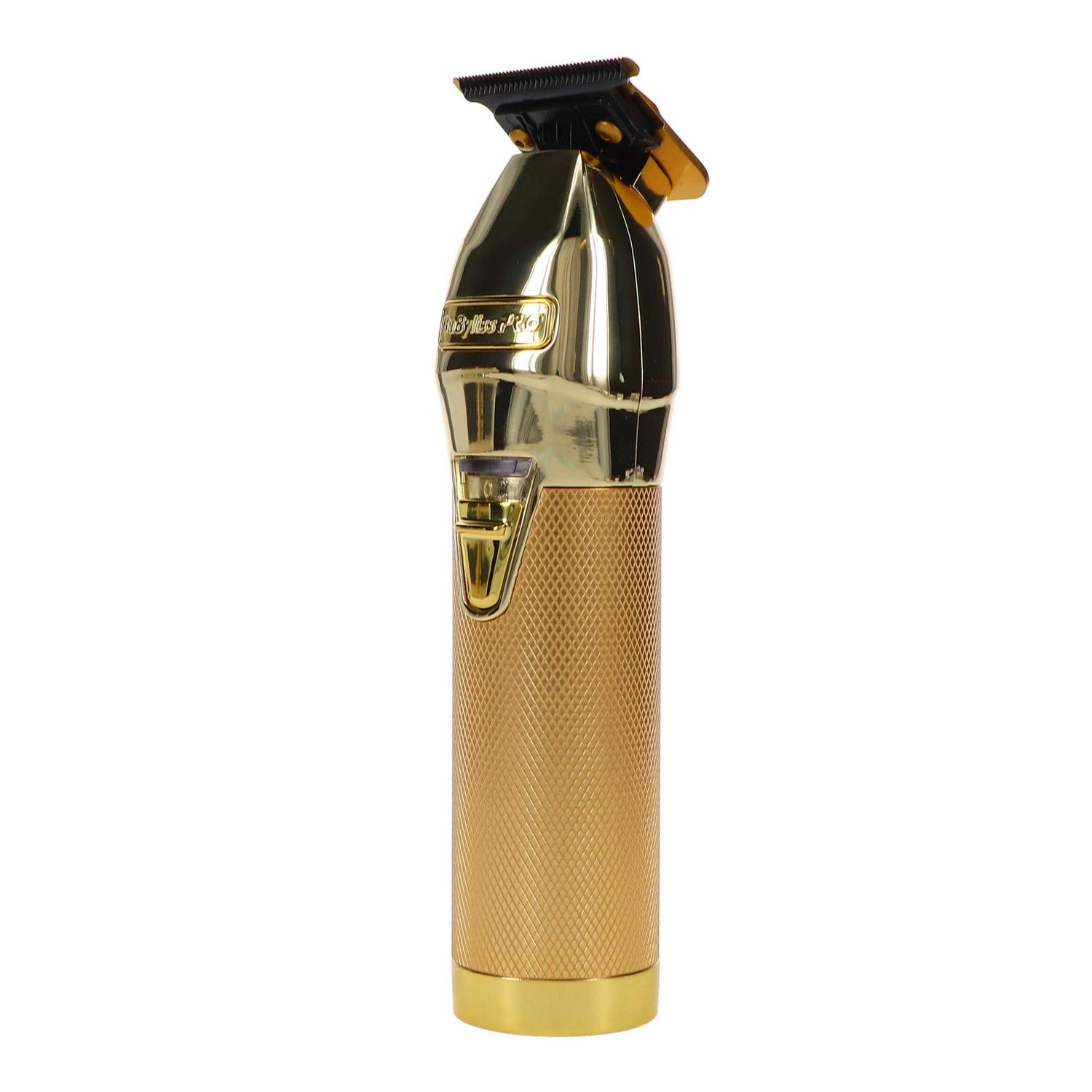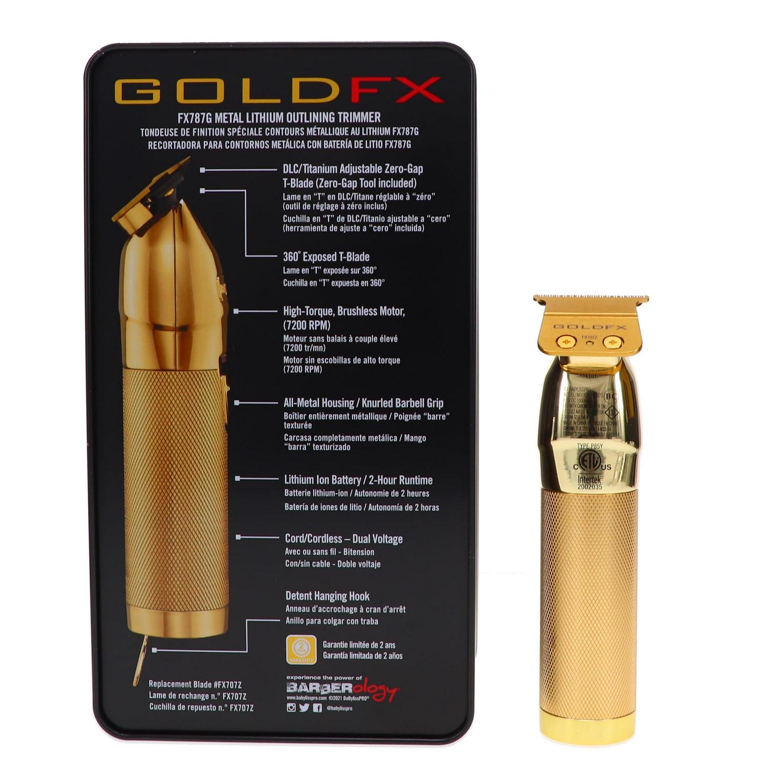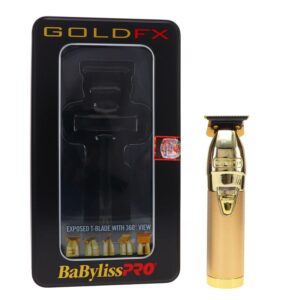 – The BaBylissPRO GoldFX Outlining Hair Trimmer is a professional, all metal, cord/cordless lithium outlining hair trimmer. Featuring an exposed T-blade with 360 degree views & high-torque, Ferrari-designed engine..This cord/cordless hair trimmer has a High-torque, Brushless, 7200 RPM Engine.Brushless Motor – 7200 rpm. Input: 100-240V (50/60Hz) 0.2A.