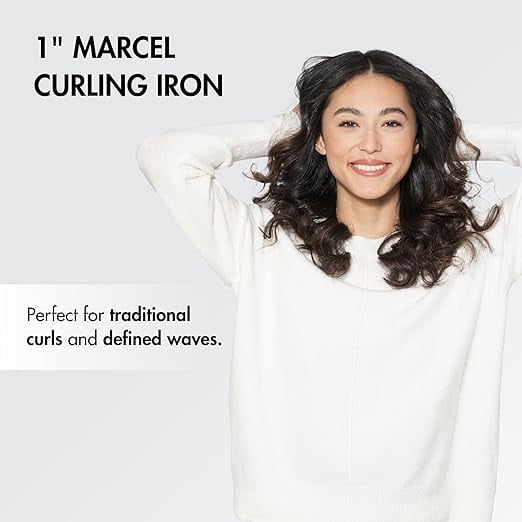 The Porcelain Ceramic 1″ Marcel Curling Iron offers advanced Porcelain Ceramic barrel technology in a convenient Marcel design for precise curls. The advanced Porcelain Ceramic barrel technology provides exceptional heat distribution and increased far-infrared heat for superior styling. Natural ions reduce static electricity and decrease styling time while stylists enjoy the rotating locking mechanism to manually open and close the clamp by twisting the handle. The result is hair that looks healthy, revitalized, and shiny. With 30 heat settings up to 430ºF, this curling iron offers precise temperature control, catering to all hair types for optimal results. The 8′ tangle-free swivel cord provides flexibility and ease of use, preventing interruptions during your styling routine. Its dual voltage capability makes it perfect for worldwide use, ensuring you can achieve beautiful curls no matter where you are.