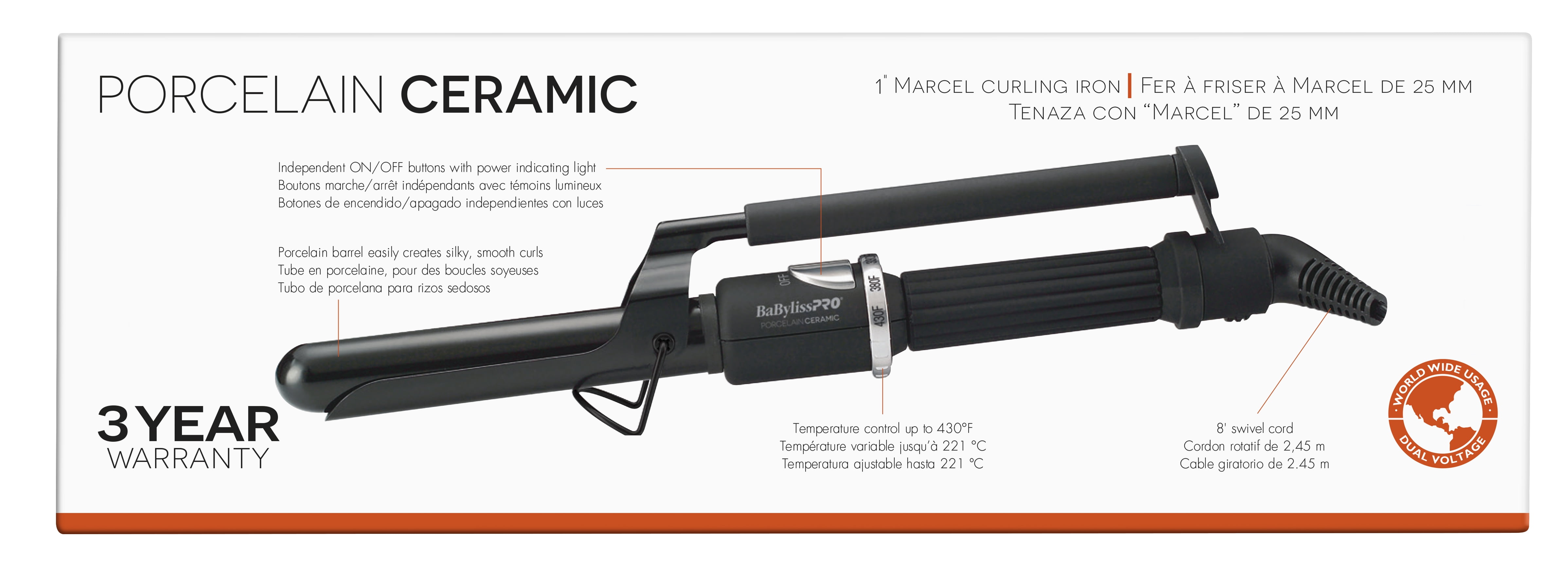 Porcelain Ceramic barrel technology creates exceptional heat distribution Heat settings up to 430ºF 8 ft. swivel cord