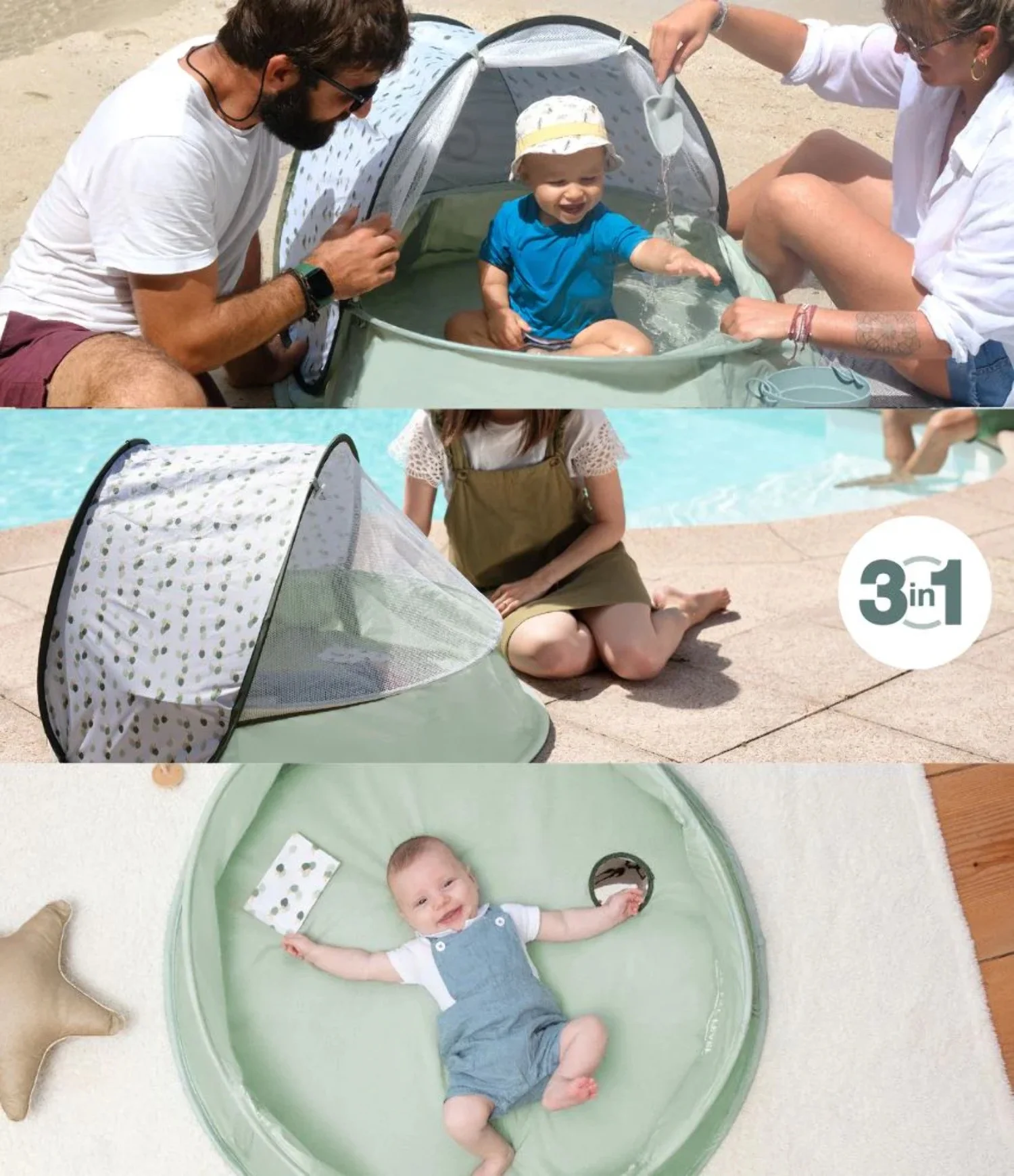 Summer’s finally arrived! So there’s only one thing you want to do – go out with your baby! Before the age of one, babies do not produce enough melanin to protect them from the sun’s UV rays. So when you go out, it’s essential to protect your little one with high protection sun cream, sunglasses, a hat, an anti-UV playpen…The Aquani helps you to protect your baby from the sun and provides stimulation right from birth. It’s also adaptable so, when your baby grows, you can use it whenever you like to keep your little one cool. This play area is easy to assemble and store away thanks to its pop-up system Protect your baby from the sun: With its high protection (UPF 50+), the Aquani blocks up to 99% of harmful rays (UVA and UVB). It also protects your little one from sand, wind and insects thanks to its folding mosquito net. Keep your baby entertained: Lying comfortably on the Aquani’s mattress, your little one can easily play with the toys provided. As your baby gets older and bigger, you can clip the toys in different places. Crinkly paper, coloured rings… your little one is spoiled for choice! Keep your baby cool: The Aquani has a removable canopy and waterproof fabric. Just remove the mattress to turn it into a large paddling pool (up to 16gal). Your baby can splash around in complete safety with you there alongside. The Aquani is versatile – you can use it both outdoors (beach, park, mountains…) and indoors. And when your baby grows, you can remove the canopy and turn it into a ball pit, for example. Well designed, practical and easy to assemble, the Aquani is easy to take with you in its carry bag with wide shoulder strap.