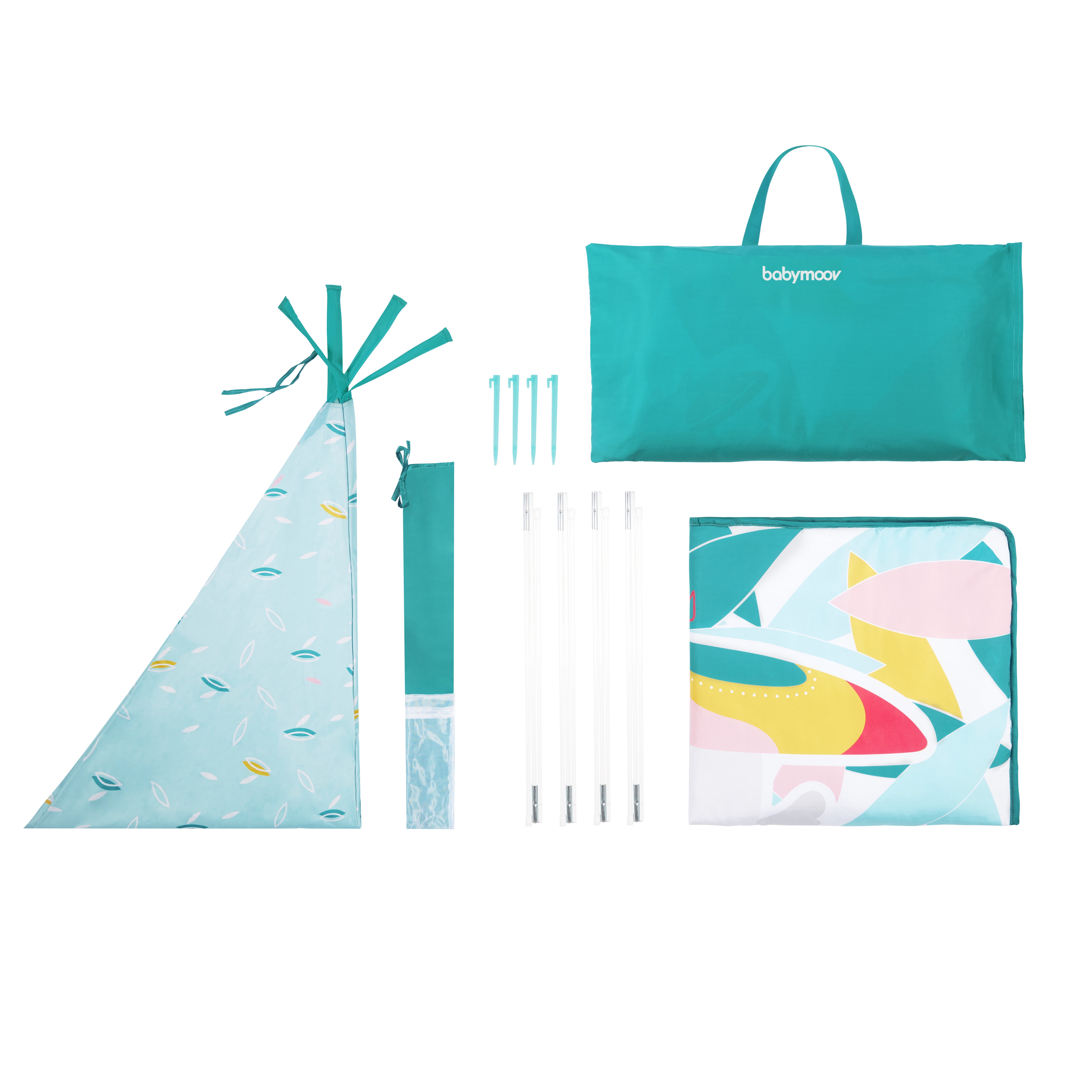 High UPF 50+ anti-UV protection Easy to set up (less than 5 minutes) For indoor or outdoor use Ventilation holes on the sides to let in as much air as possible Comfortable, removable double-sided mattress: 1 soft side and 1 waterproof side to provide protection from dampness in the ground The play mat can be used on its own 4 pegs for fixing to the ground Carry bag with handle included