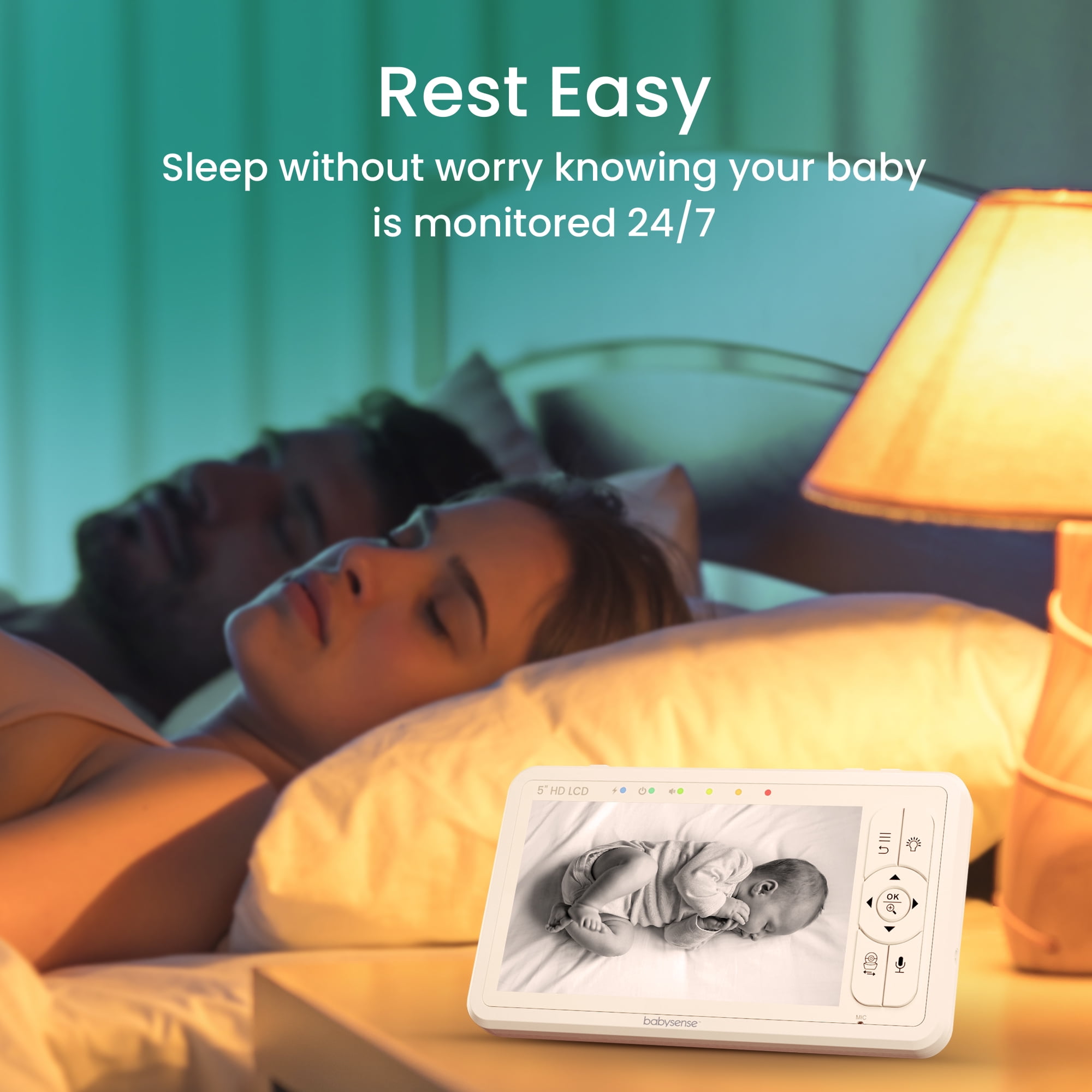 Hack-Proof & High Definition View: The 720 HD image on the large 5″ LCD display provides crystal clear secure viewing. Enjoy exquisite remote control convenience with remote pan and tilt and up to x 4 zoom, at a 960ft range. Split-Screen HD Display with 2 HD Cameras: Unlike most standard baby monitors, this HD video baby monitor is equipped with 2 HD cameras and a split-screen feature, allowing to see both cameras or babies side by side on the same screen. You are sure to always know what’s going on in your baby’s room!. Connect up to 4 cameras in different rooms. Soothe & Comfort Your Baby: Use the two-way audio, white noise sound or programmed lullaby sounds to calm your baby remotely. Watch your kid in the nursery 24/7, thanks to the IR night vision of this high-end portable baby cam monitor. Never Miss a Single Moment: We use a novelty 4000 mAh battery and power-saving mode for auto-activation of the monitor based on the sound of your baby. Enjoy the built-in adaptable intensity night light, to ensure an optimal sleeping environment in your baby’s room. Invest in Your Peace of Mind: There’s nothing more stressful than not knowing what your little one is doing. That is why our baby monitor is supplied with 2 cameras, which do not require Wi-Fi (no hacking risks) and allow you to sleep better at night. Why HD S2 by Babysense: More coverage with 2 cameras. The screen features a Split-Screen function, allowing to see both cameras or babies side by side on the same screen. Great control with remote pan and tilt. Clear overview with crisp HD 720P display & 4x magnification Interactive use with two-way audio. Long-lasting battery (4000 mAh) with a power-saving mode based on the sounds in the room (VOX). Wider range (up to 960ft in open space) Now it’s time to equip your home and days as a parent with a more advanced baby monitoring system.