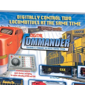 Digital Commander DCC Equipped Ready To Run Electric Train Set – HO Scale. The Digital Commander has everything you need to get started in digital model railroading in one ready-to-run set! It includes our exclusive, easy-to-use E-Z Command digital system that lets you independently control the speed, direction, and lighting of two decoder-equipped locomotives. Take control of your own freight rail empire with the Digital Commander! This digitally controlled train set features: DCC-equipped EMD GP40 locomotive with operating headlight, DCC-equipped EMD FT-A locomotive with operating headlight, plug-door box car, open quad hopper, wide-vision caboose, E-Z Command Control Center with wall pack and plug-in wiring, body-mounted E-Z Mate couplers, 56″ x 38″ oval of nickel silver E-Z Track, including 12 pieces curved track, 4 pieces straight track, 1 terminal rerailer, 1 manual turnout – left, under-track magnet with brakeman figure, and 1 Hayes bumper, illustrated instruction manual. See video below for more!