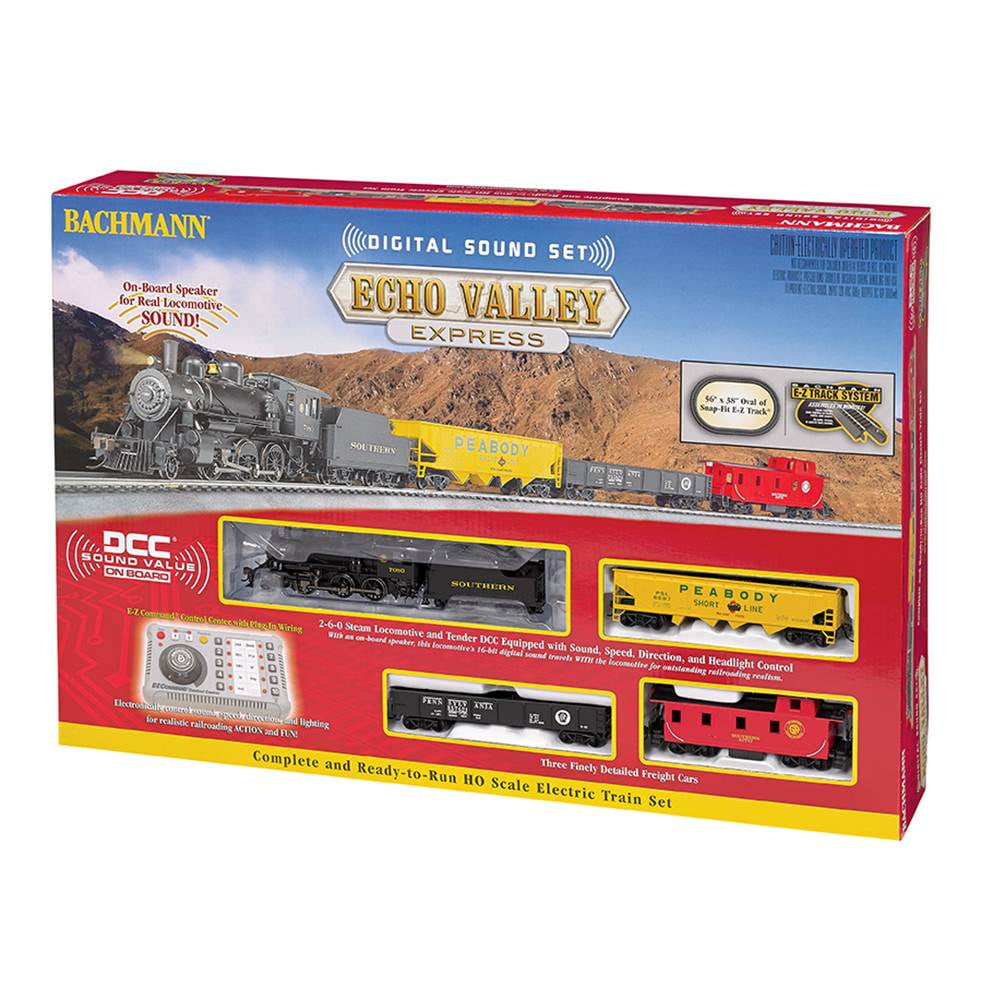 Do you hear that whistle blowing? The Bachmann Trains Echo Valley Express HO Scale Electric Train Set is bound non-stop for fun. This light and DCC sound-equipped Baldwin 2-6-0 makes realistic huffing, puffing, whistling, and bell sounds, all controlled from the E-Z Command digital control system. This electric model set also includes a coal car, gondola car, quad-hopper, and off-center caboose. It also Includes E-Z Command Control Center with wall pack and speed controller, as well as pieces of curved and straight track that can assemble into a 56 x 38 inch circuit. Grab the kids and hop on to the Bachmann Trains Echo Valley Express HO Scale Electric Train Set for hours of fun watching and listing to your train chugging along.