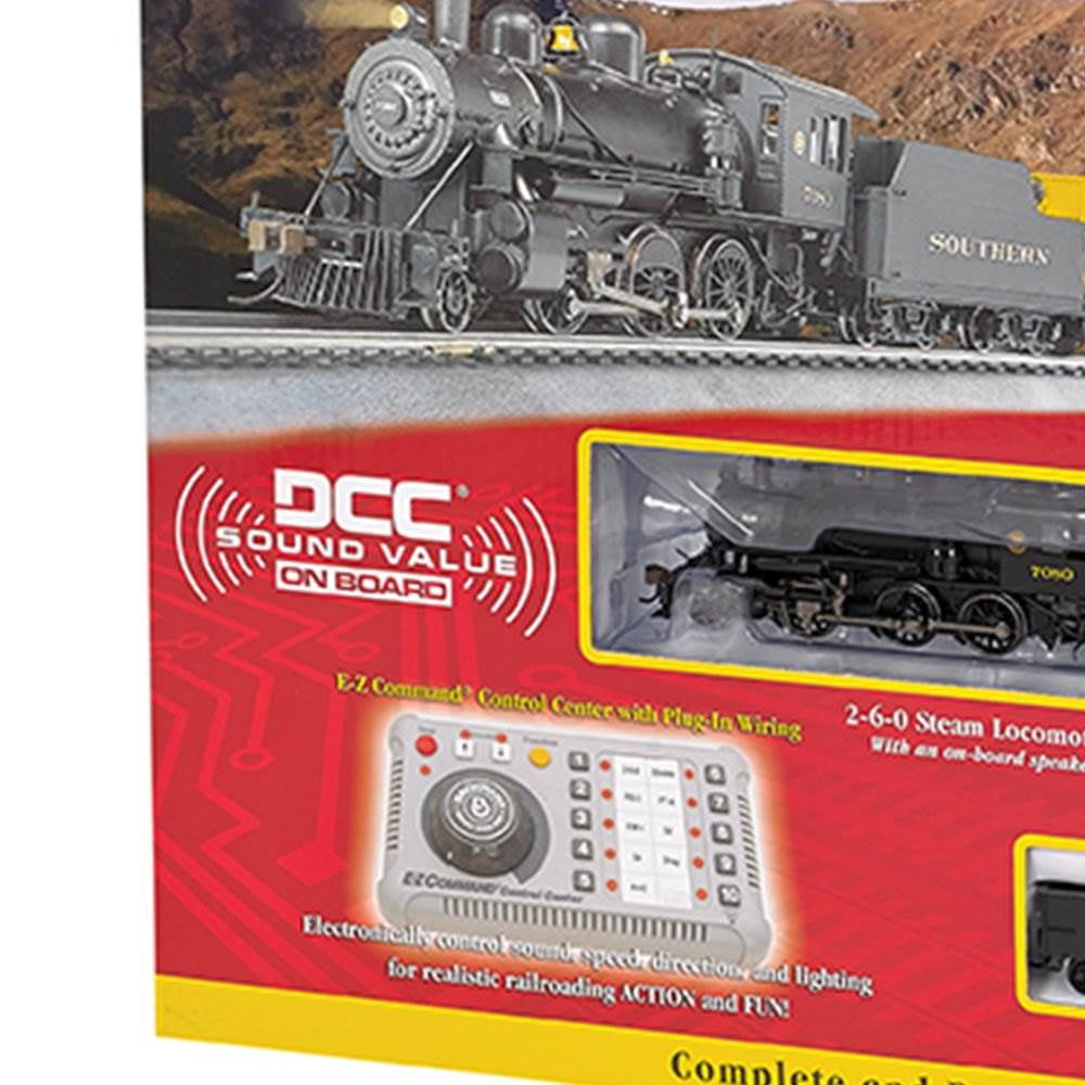 Includes DCC sound-equipped 2-6-0 steam locomotive with tender and operating headlight, gondola, quad hopper, and off-center caboose E-Z Command Control Center with wall pack and speed controller Body-mounted E-Z Mate couplers 56 x 38 inch oval of snap-fit nickel silver E-Z Track including 12 pieces of curved track, 3 pieces of straight track, and 1 plug-in terminal rerailer Scale: HO 1:87 – Conforms with NMRA (National Model Railroad Association) standards Illustrated instruction manual Dimensions: 56 x 38 x 2 inches Weight: 6.6 pounds