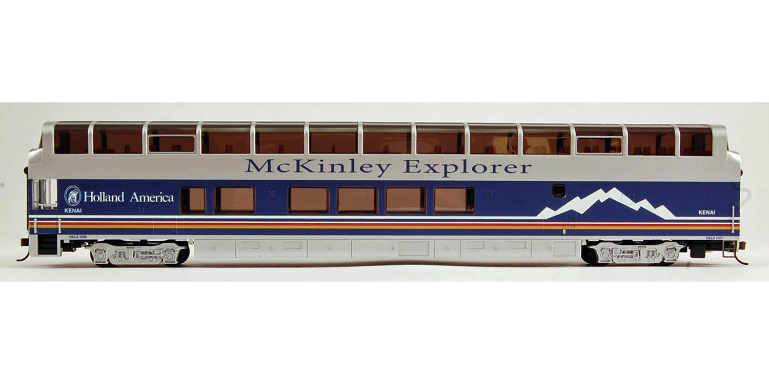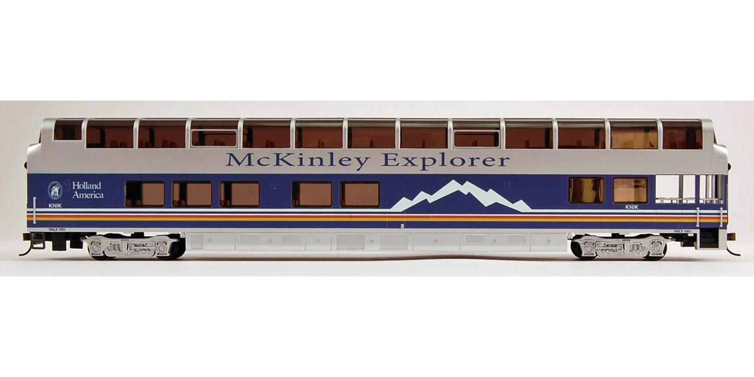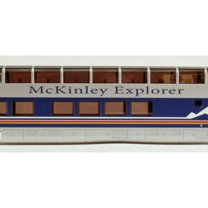 McKINLEY EXPLORER Ready To Run Electric Train Set – HO Scale. Treating passengers to breathtaking views of the Alaskan wilderness in special vista-dome cars is the McKinley Explorer. The modern version of the McKinley Explorer features models of bi-level dome dining-lounge cars. At 18 feet 2 inches tall and 89 feet long, these cars manufactured by the Colorado Railcar Company are the largest dome cars ever built. This ready-to-run train set includes: EMD GP40 locomotive with directional headlights, two 89′ Colorado Railcar full-dome passenger cars (the Knik and Kenai, both named after Alaskan Rivers), body-mounted E-Z Mate couplers, 63″ x 45″ oval of snap-fit E-Z Track, power pack and speed controller, illustrated instruction manual.