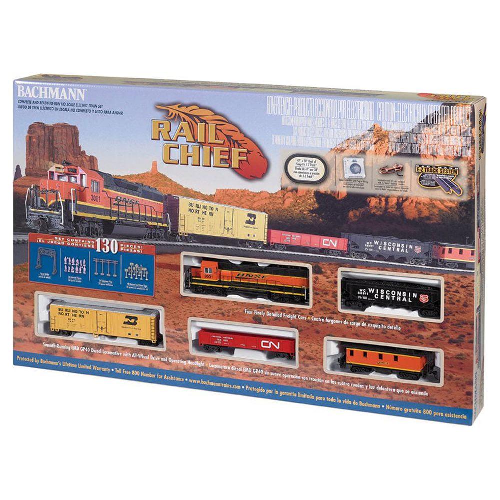 Rail Chief Ready-to-Run HO Scale Electric Train Set. You will command the rails with our striking Rail Chief set. Complete with miniature people and a signal bridge, this 130-piece set will let you oversee your own detailed railroading empire. This ready-to-run set includes an EMD GP40 diesel locomotive with operating headlight, quad hopper, gondola, steel reefer, caboose, 47 x 38 oval of E-Z Track, signal bridge, 36 miniature figures, 24 telephone poles, 48 railroad and street signs, power pack and speed controller.