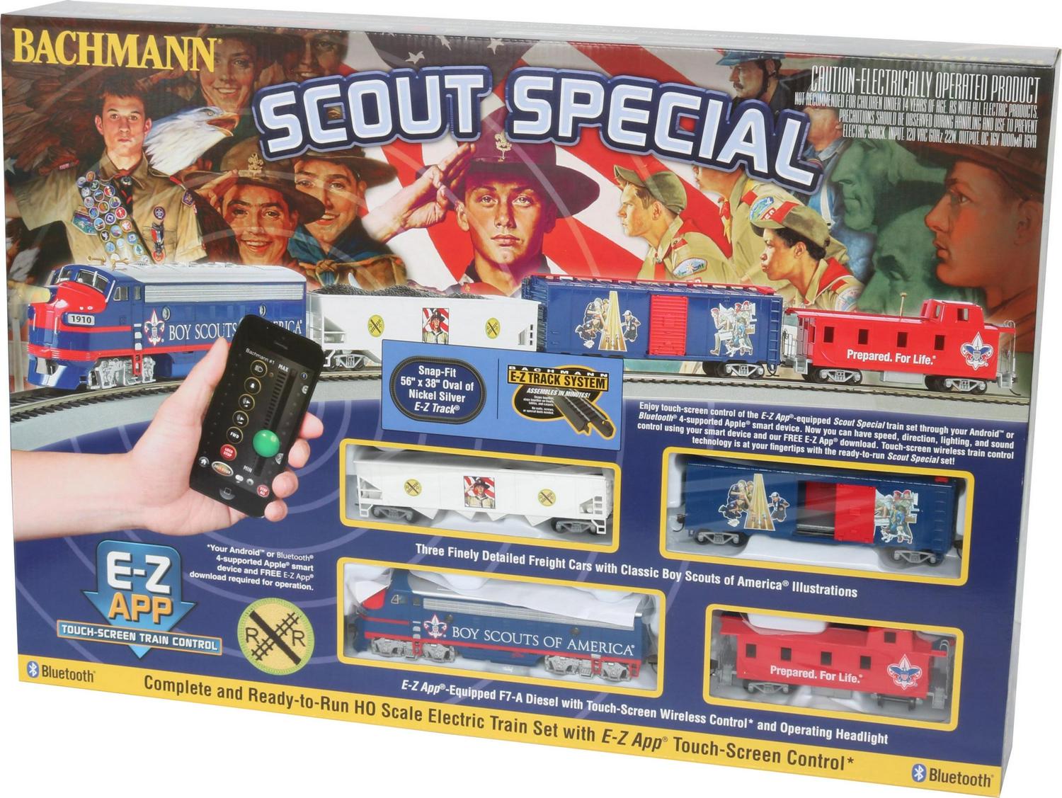 SCOUT SPECIAL – BOY SCOUTS OF AMERICA E-Z App Smart Phone Controlled HO Scale Electric Train Set. Enjoy wireless touch-screen control of this E-Z App-equipped locomotive through your smart device. Now you can have speed, direction, lighting, and sound control at your fingertips using your phone or tablet for Android or Apple smart device and the FREE E-Z App download. Features of E-Z App Touch-Screen Train Control include: wireless control with any phone or tablet for Android (running Android 4.3 or newer) or any Bluetooth 4-supported iPhone, iPad, or iOS device (includes iPhone 4s, 5, 5c, 5s, 6, and 6 Plus; iPad Air and iPad mini , 3rd and 4th generations; and iPod touch 5 or newer), operates from up to 100 feet away with Bluetooth Smart technology, realistic, dynamic engine sound broadcast through your smart device, requires 16 volt DC or DCC track power for operation, ready to launch and use instantly after downloading the FREE Bachmann E-Z App from the Google Play store or Apple App Store, no configuration or additional equipment required. This E-Z App -equipped train set features: E-Z App-equipped-equipped F7-A diesel with touch-screen wireless control and operating headlight, 40 box car with Norman Rockwell and Joseph Csatari illustrations, 40 quad hopper with BSA Railroad Merit Badge design, off-center caboose, 56 x 38 oval of snap-fit nickel silver E-Z Track, wall power pack, illustrated instructions.