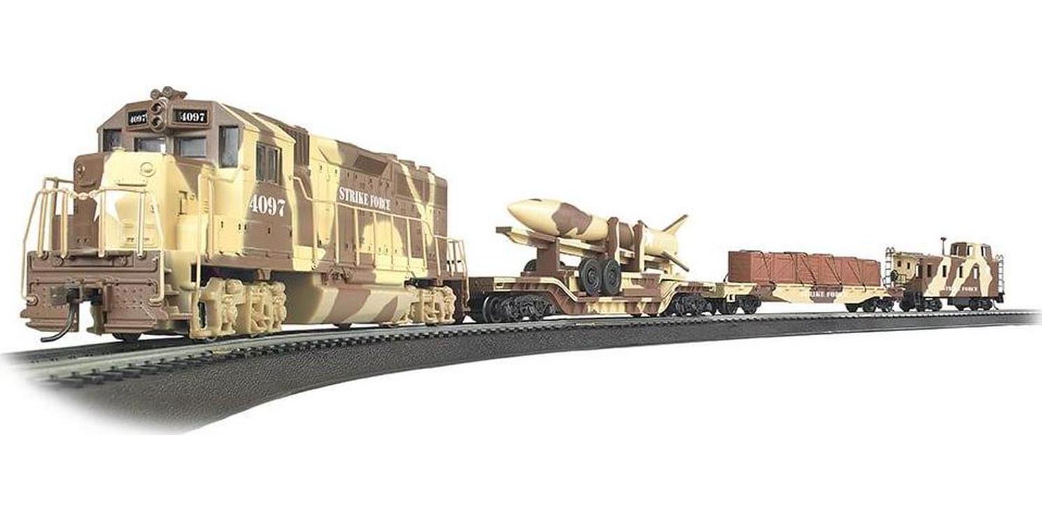 Strike Force Ready To Run Electric Train Set – HO Scale. Rail transport has played a crucial role in successful U.S. military campaigns since the Civil War. Often serving as the logistical backbone of large operations, military trains deliver personnel, weapons, ammunition, and food to the troops in the field. With our Strike Force train, we honor the tireless efforts of our men and women in uniform. This ready-to-run train set includes: EMD GP40 diesel locomotive with operating headlight, flat car with crates, center-depressed flat car with camouflage missile, offset cupola caboose, body-mounted E-Z Mate couplers , 47″ x 38″ oval of snap-fit E-Z Track, power pack and speed controller, illustrated instruction manual.