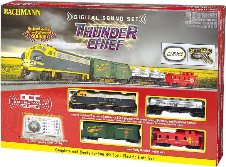 Thunder Chief Digital Starter Set Digital Command Control with Sound HO Scale. With the roar of its mighty motor and a blast of its horn, the Thunder Chief announces its arrival. Commanding the attention of one and all, there is no missing the excitement of the Thunder Chief storming into the station. Featuring a DCC sound-equipped F7-A with a diesel sound package that includes prototypical prime mover, three air horns, and bell all in polyphonic 16-bit sound that you can control with our E-Z Command digital control system. Rolling stock in this ready-to-run set includes a 40 foot box car, three dome tank car and caboose along with an E-Z Command control center, and 56 x38 oval of nickel silver track.