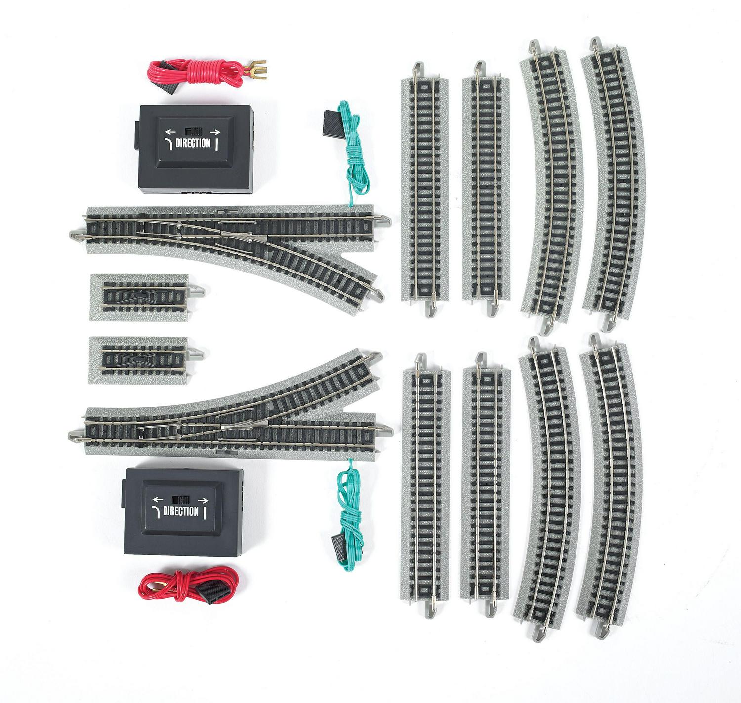 – Set includes: 4 pieces 11.25 radius curved track, 4 pieces of 5 straight track, 1 remote turnout-left, 1 remote turnout-right, 2 Hayes bumpers
