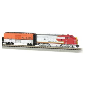 SUPER CHIEF Ready To Run Electric Train Set – N Scale. With the pride and power of a born leader, the mighty Super Chief thunders along the rails. Spearheading the charge is an F7-A diesel locomotive with the Santa Fe s distinctive red and silver war bonnet paint scheme. The N scale Super Chief ready-to-run set comes complete with: F7-A locomotive with operating headlight, box car, steel gondola, offset cupola caboose, 24″ circle of nickel silver E-Z Track, power pack and speed controller, illustrated instruction manual.