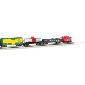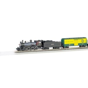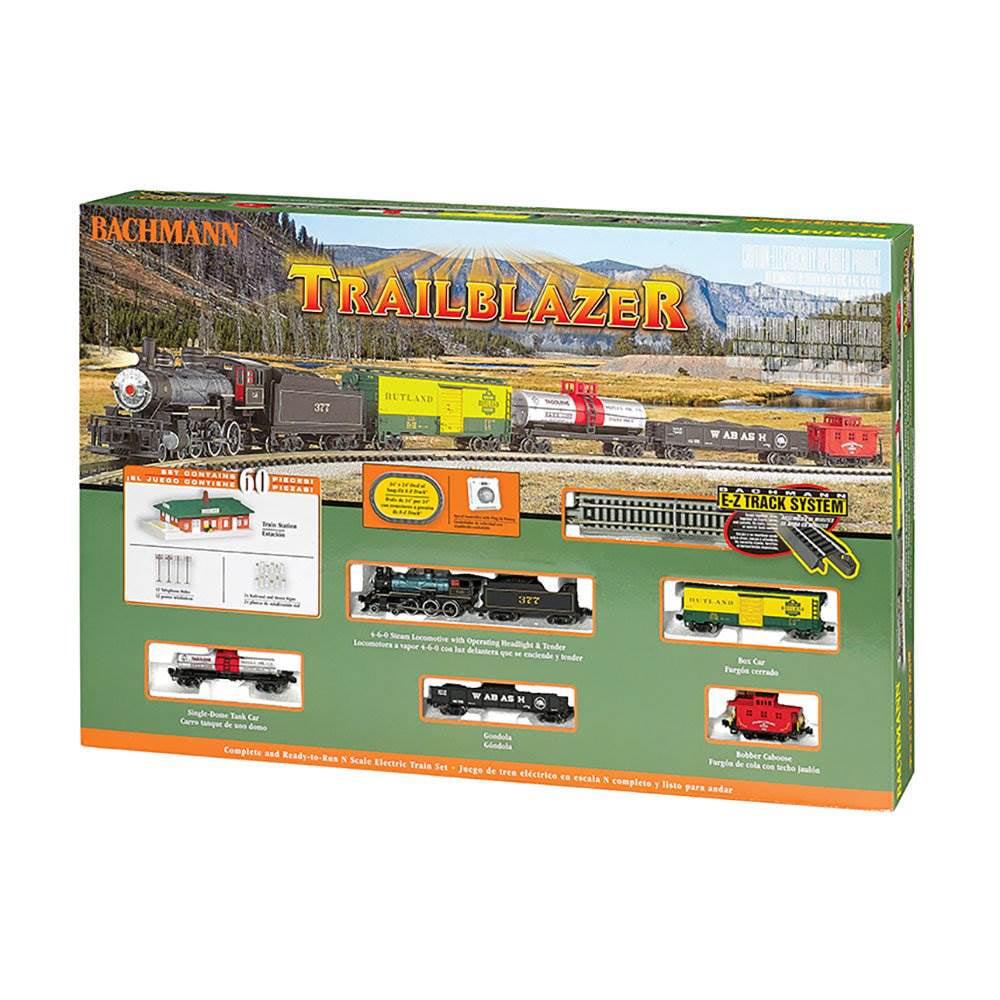 TRAILBLAZER Ready To Run Electric Train Set – N Scale. As the West developed from desolate wilderness to bustling cities, it was trains such as the Trailblazer that spearheaded America s explosive growth from coast to coast. Our 60-piece Trailblazer set with its 4-6-0 locomotive lets you experience all the excitement of the Iron Horse s journeys through the crossroads of railroading history! This ready-to-run train set includes; 4-6-0 steam locomotive and tender with operating headlight, box car, gondola car, single-dome tank car, old-time caboose, 34″ x 24″ oval of snap-fit E-Z Track, train station, 24 railroad and street signs, 12 telephone poles, power pack and speed controller, illustrated instruction manual.