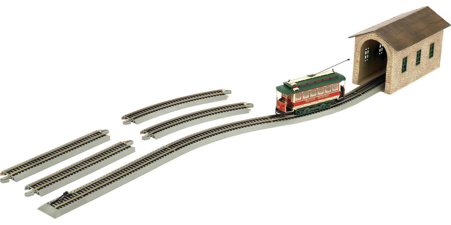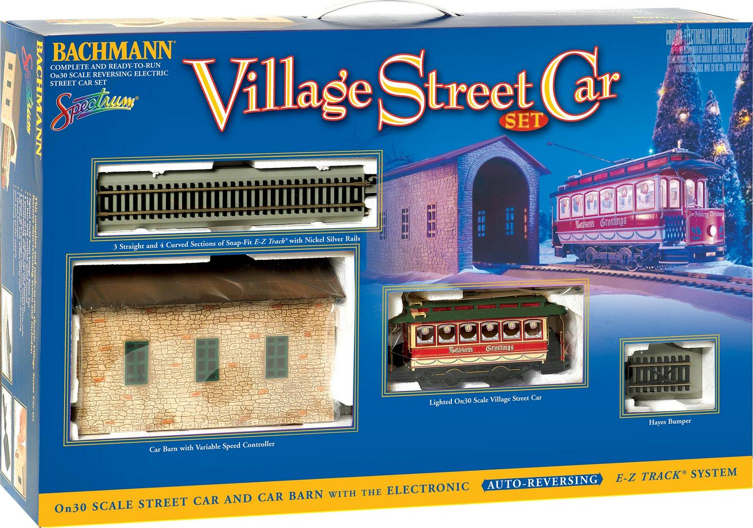 Village Streetcar “Christmas” Auto Reversing Set – On30 Scale – Runs on HO Track. Our Village Street Car Set features an electronic auto-reversing E-Z Track system that s the perfect solution for point-to-point passenger transit on your layout. With a variable speed controller to determine the rate of travel, you can enjoy the ride while your town or city comes to life! Features include: street car with headlights and lighted interior, variable speed control,4 pieces of 18″ radius curved, auto-reversing E-Z Track, 3 pieces of 9″ straight, auto-reversing E-Z Track, 1 piece of straight E-Z Track with attached station house, 1 Hayes bumper, illustrated instruction.