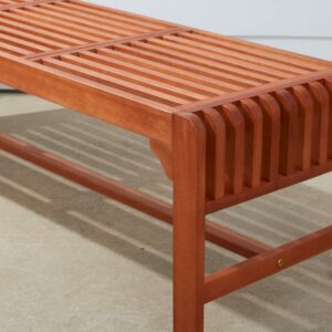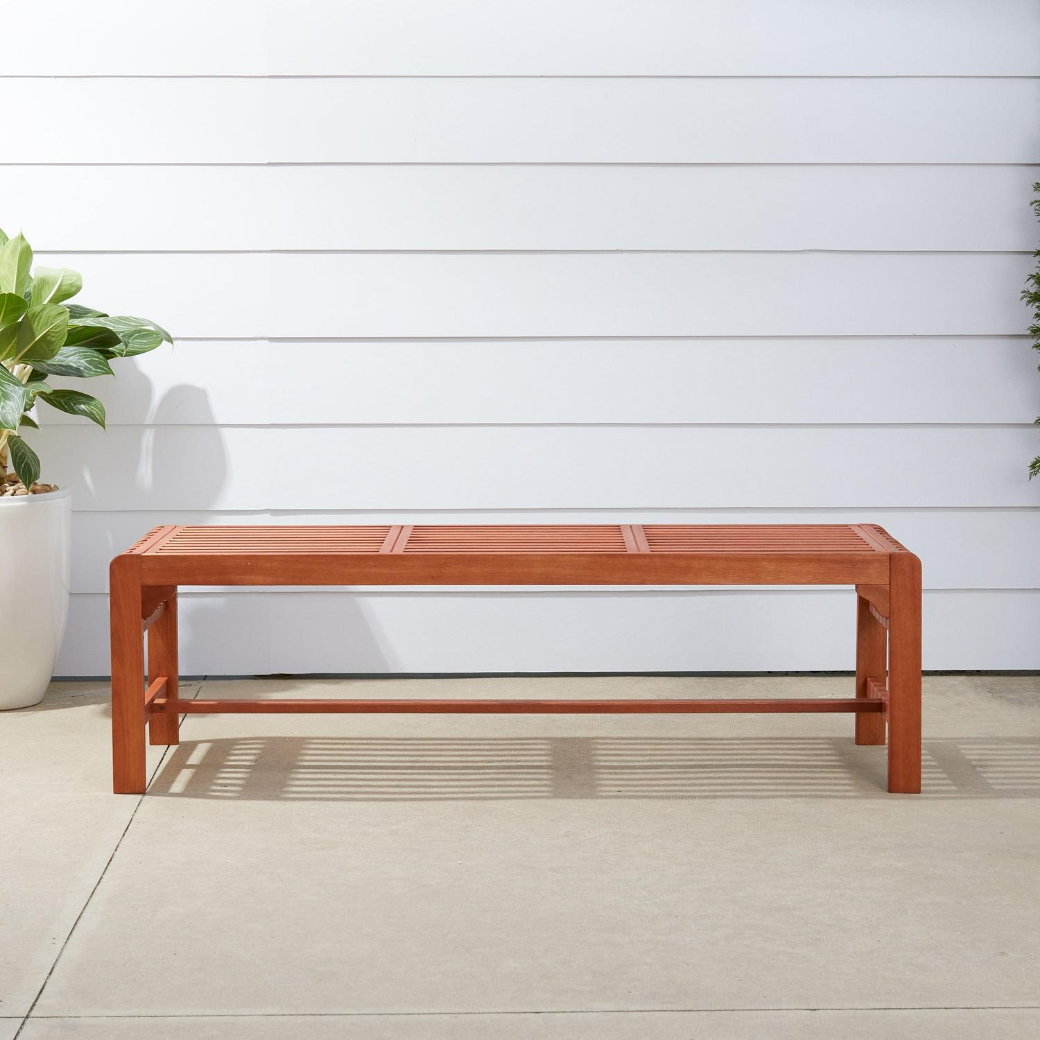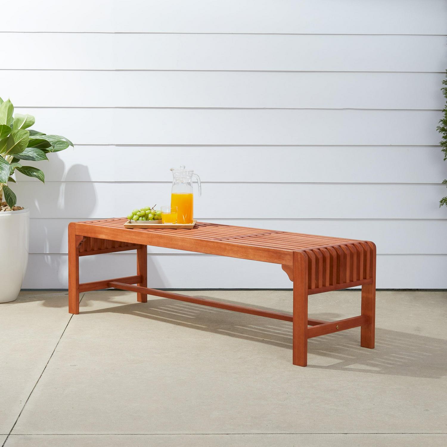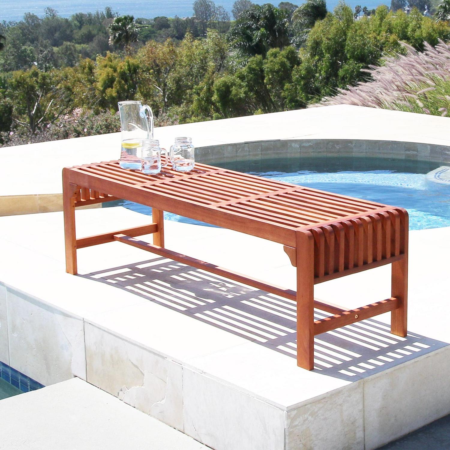 Let your friends and family relax in comfort while enjoying cocktail and snacks on this Malibu Outdoor Patio 5-foot Wood Backless Garden Bench! Made from solid Eucalyptus wood, this bench can stand up to all kinds of changes in the weather. Comes in the beautiful Natural Wood Finish, this will be a great addition to your outdoor patio!
